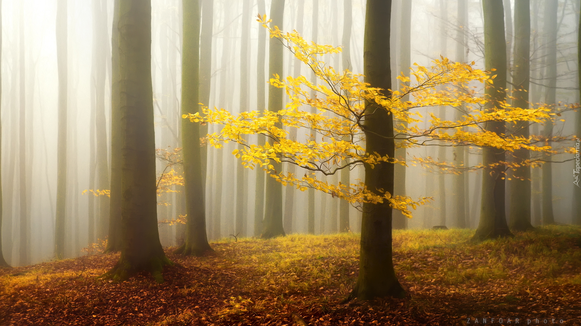 Edytor tapety: Pożółkłe liście na gałęziach w zamglonym lesie