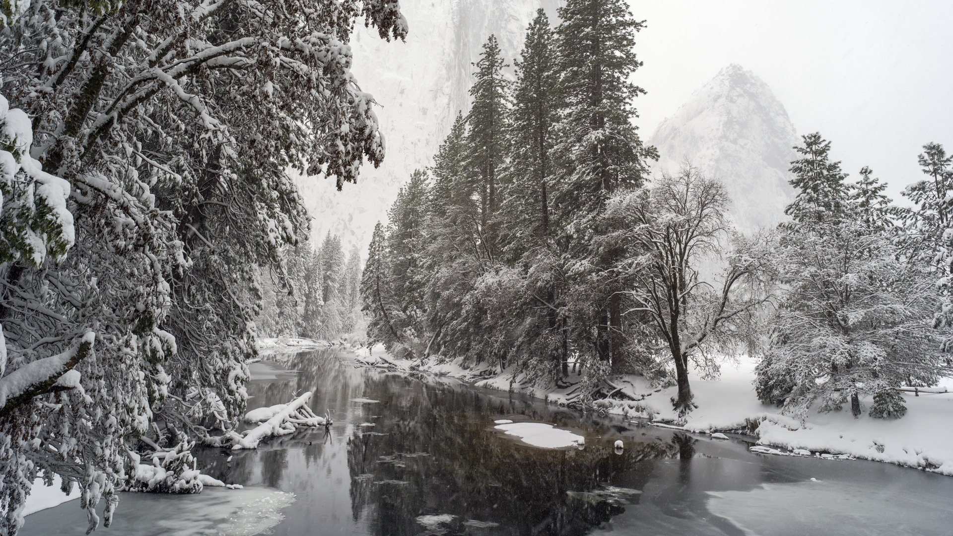 Edytor tapety: Drzewa wzdłuż rzeki zimową porą