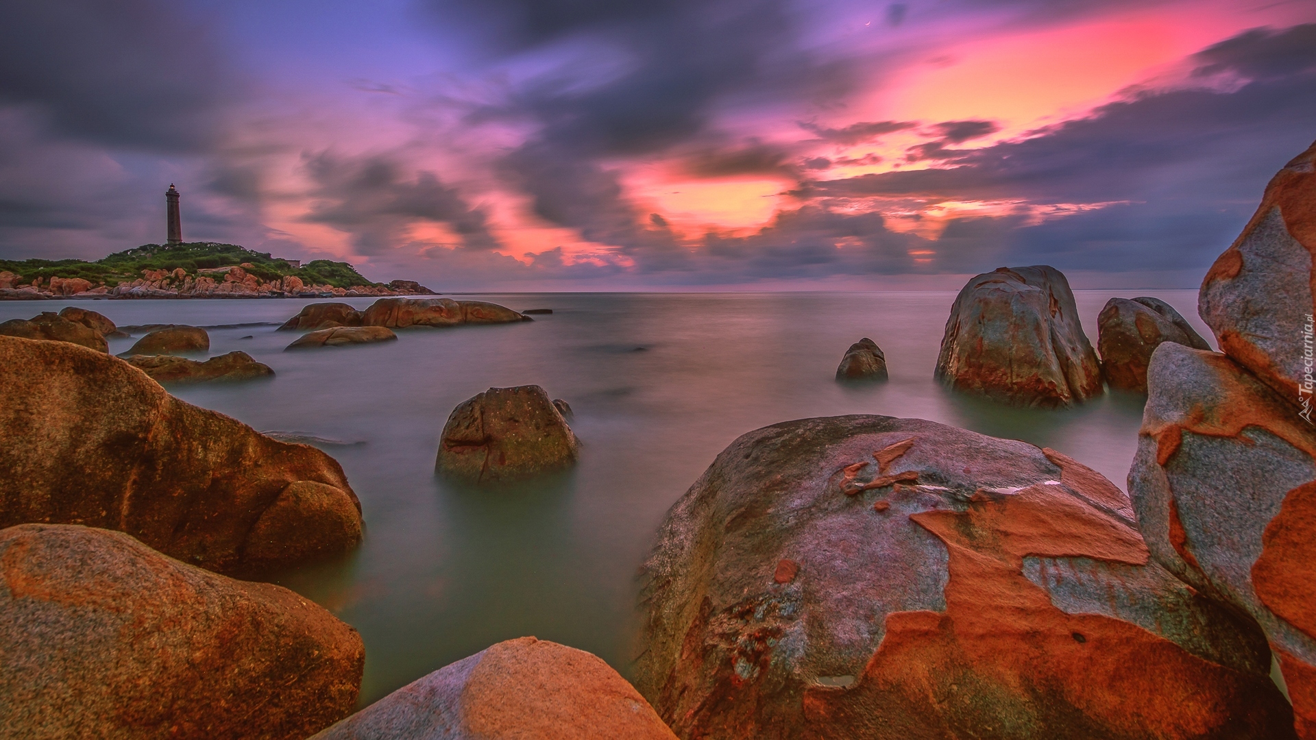 Edytor tapety: Skały w morzu niedaleko latarni morskiej