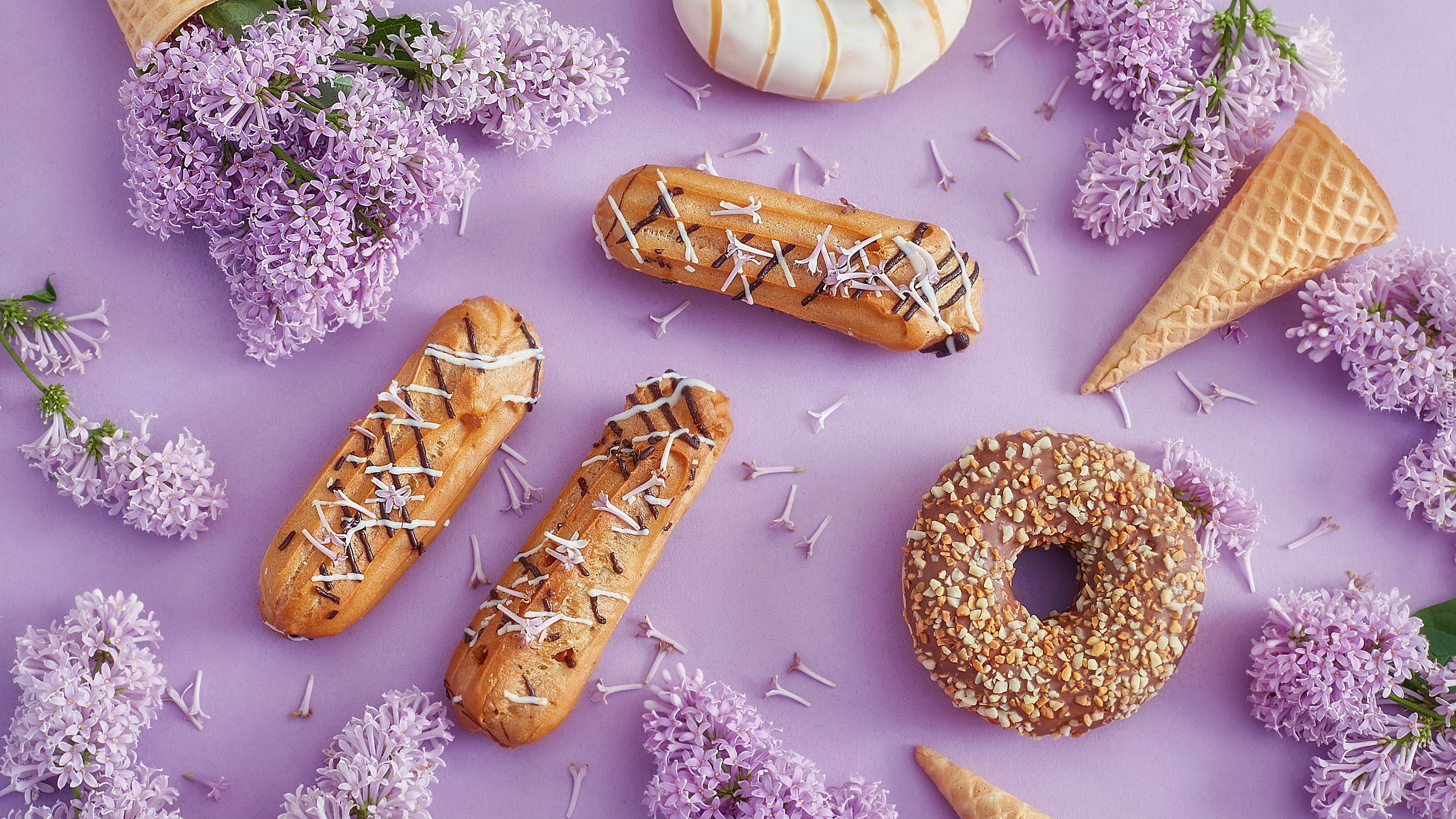 Edytor tapety: Gałązki bzu ułożone wokół eklerków i donuta