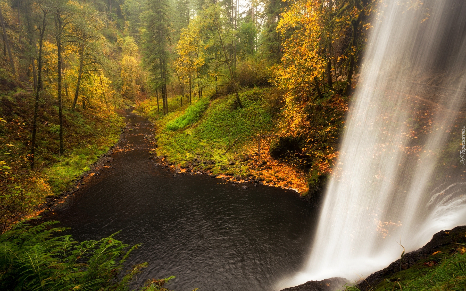Edytor tapety: Wodospad wpadający do rzeki w jesiennym lesie