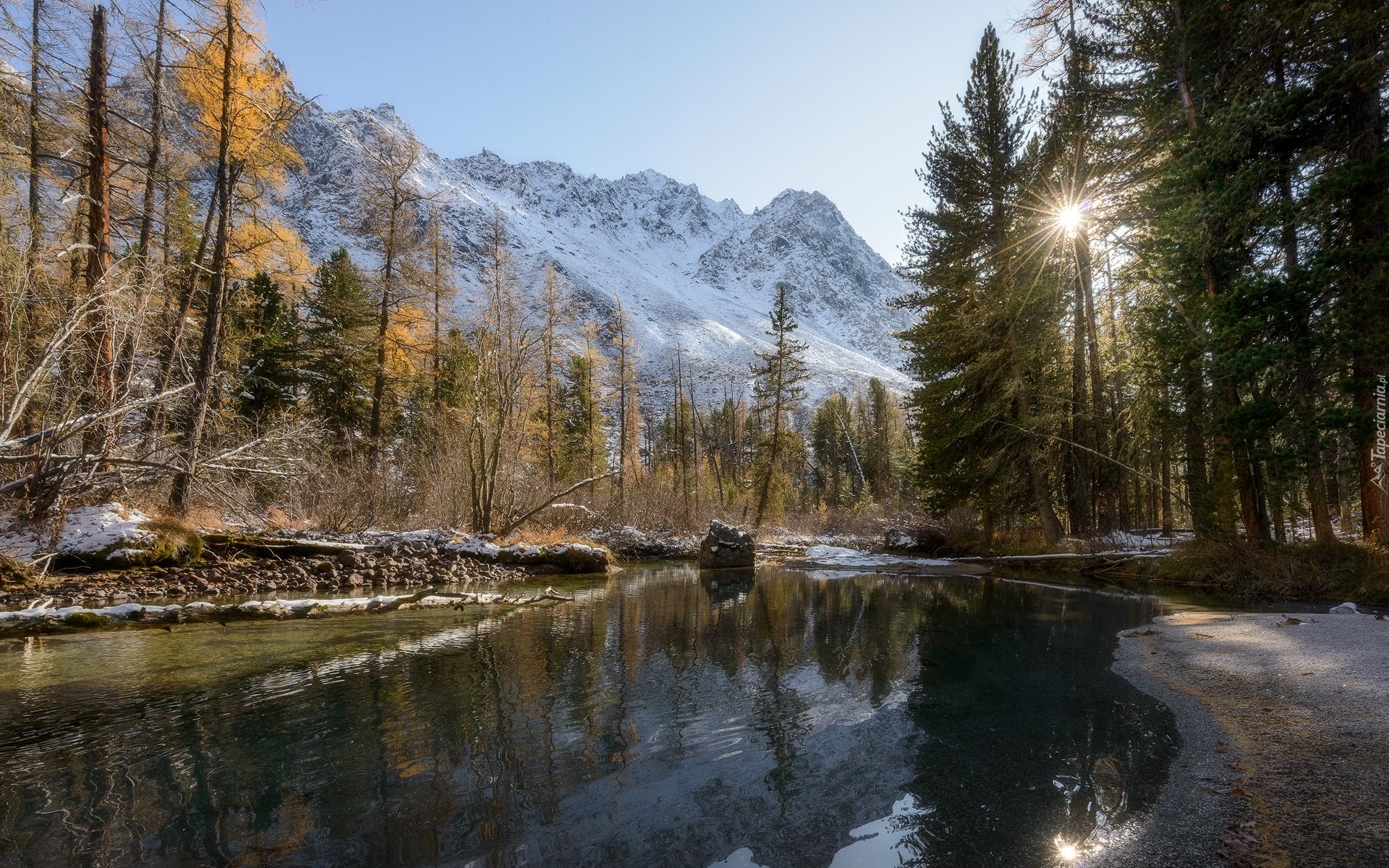 Edytor tapety: Świerki nad górską rzeką