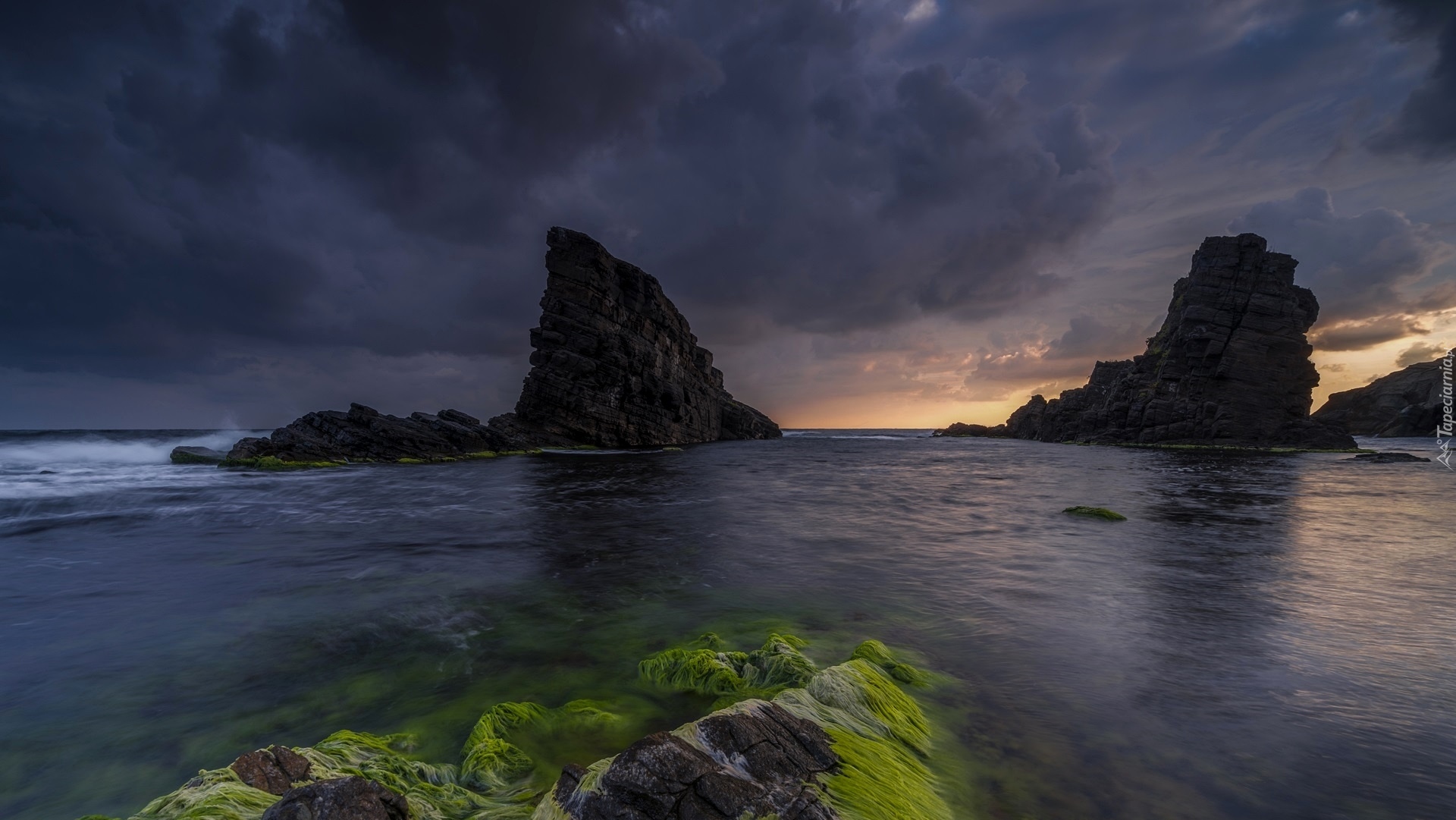 Edytor tapety: Ciemne chmury nad skałami w morzu o poranku