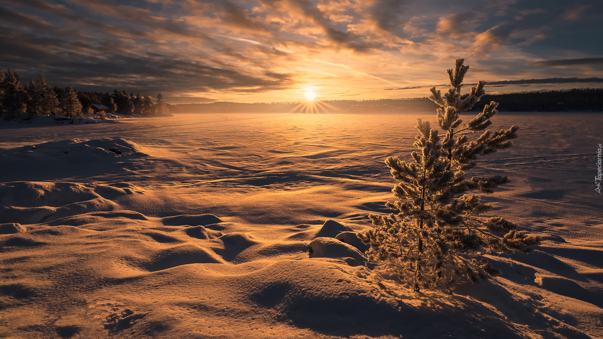 Edytor tapety: Zachód słońca nad zaśnieżonym jeziorem