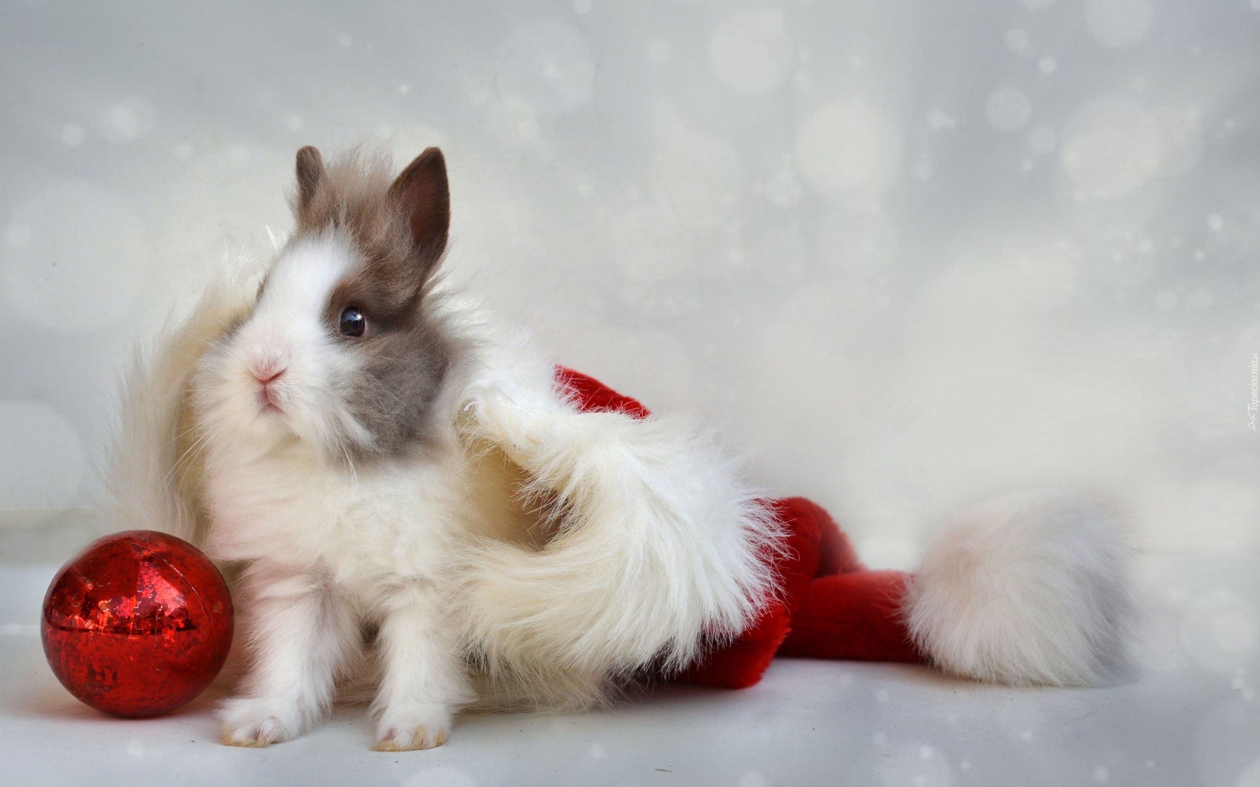Edytor tapety: Królik w czapce Mikołaja obok czerwonej bombki