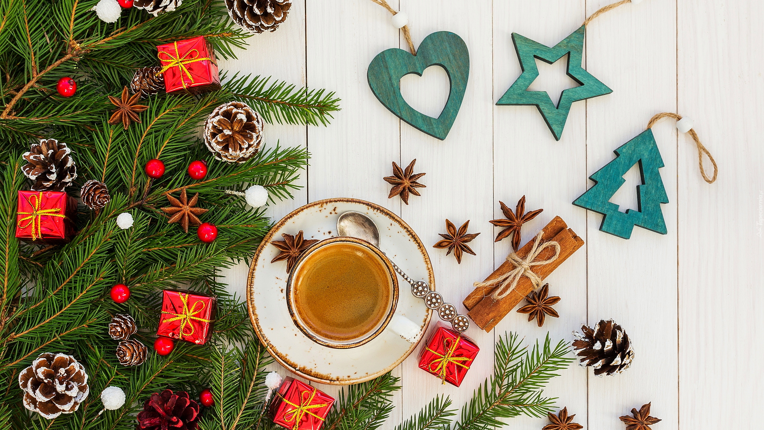 Edytor tapety: Świąteczna kawa przy ozdobionych gałązkach