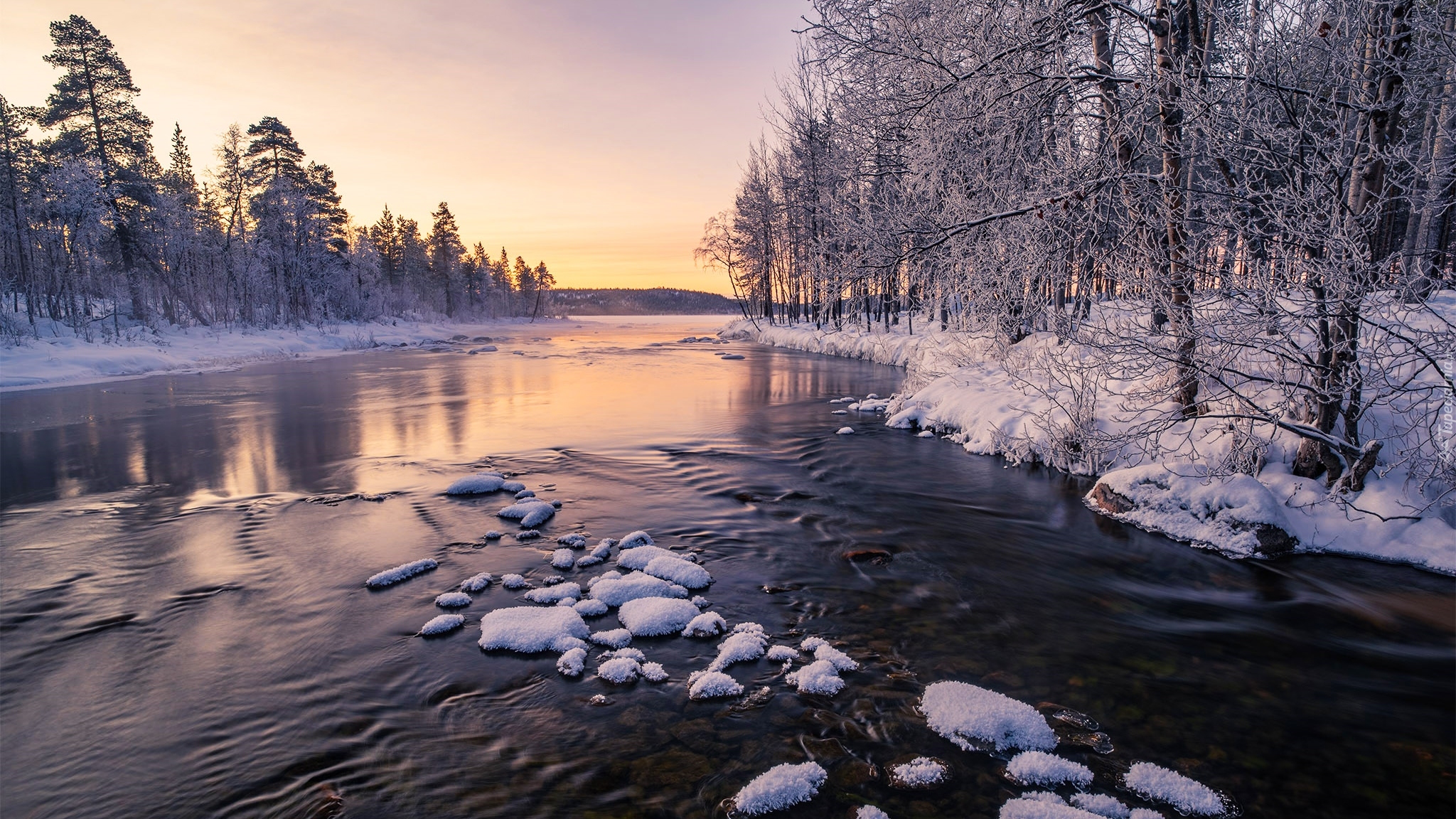 Edytor tapety: Poranek nad rzeką wśród oszronionych drzew