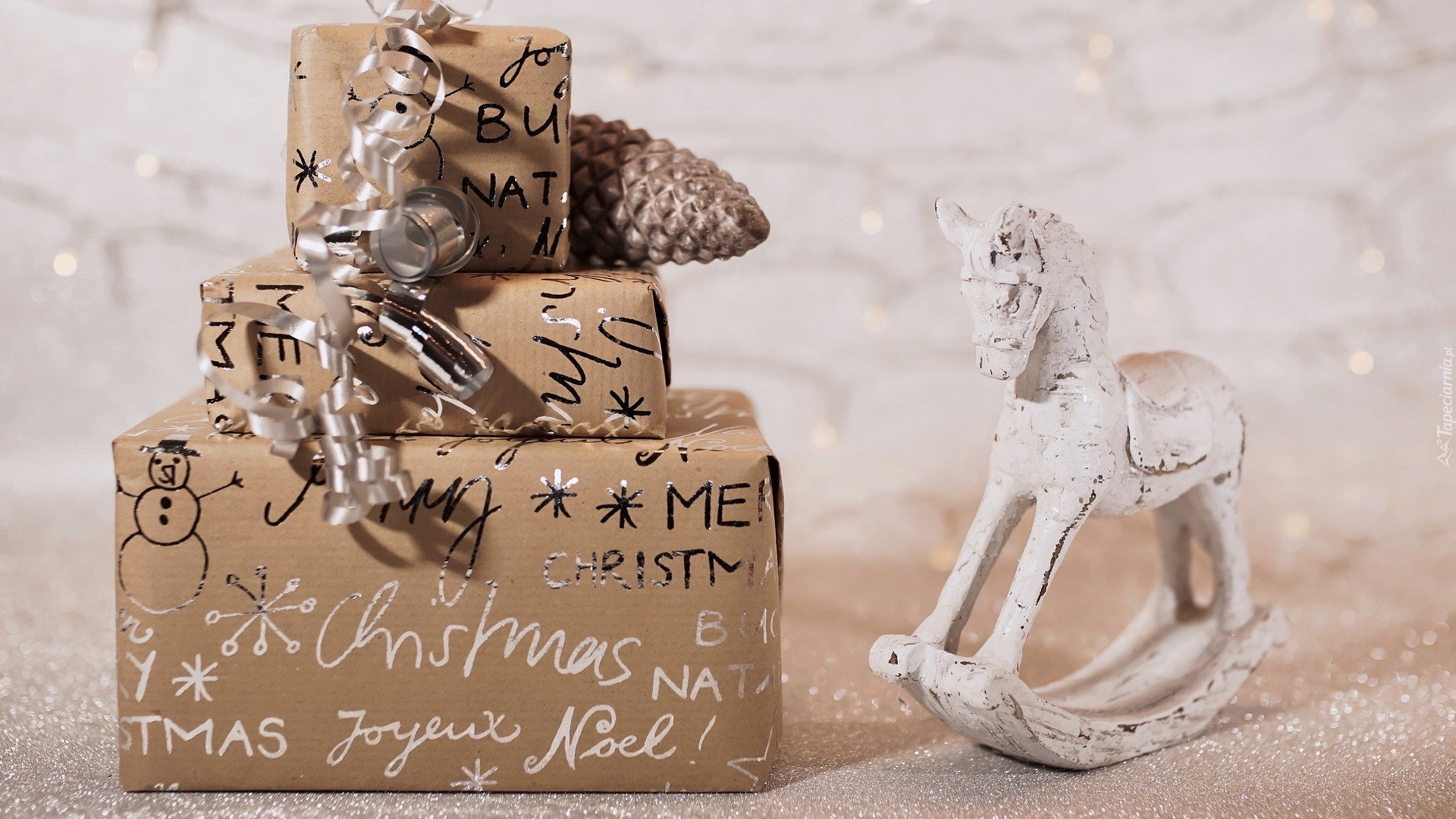Edytor tapety: Świąteczne prezenty obok figurki konika na biegunach