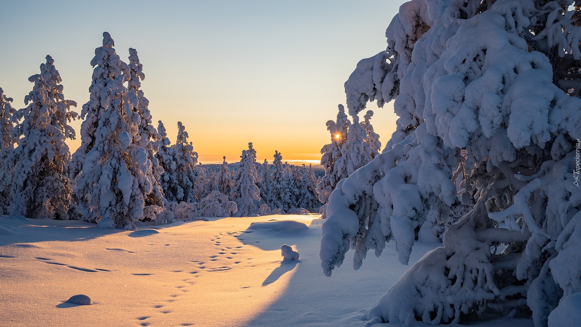 Edytor tapety: Zasypane śniegiem świerki w blasku wschodzącego słońca