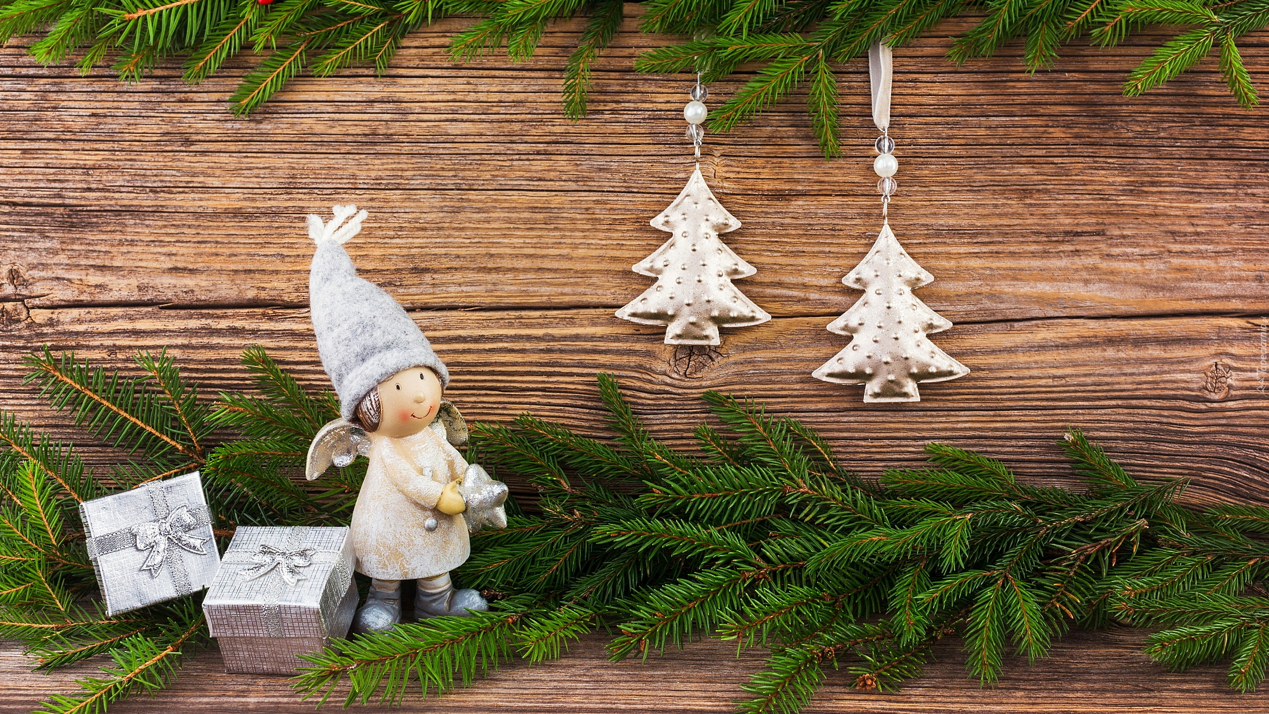 Edytor tapety: Aniołek na gałązkach obok prezencików
