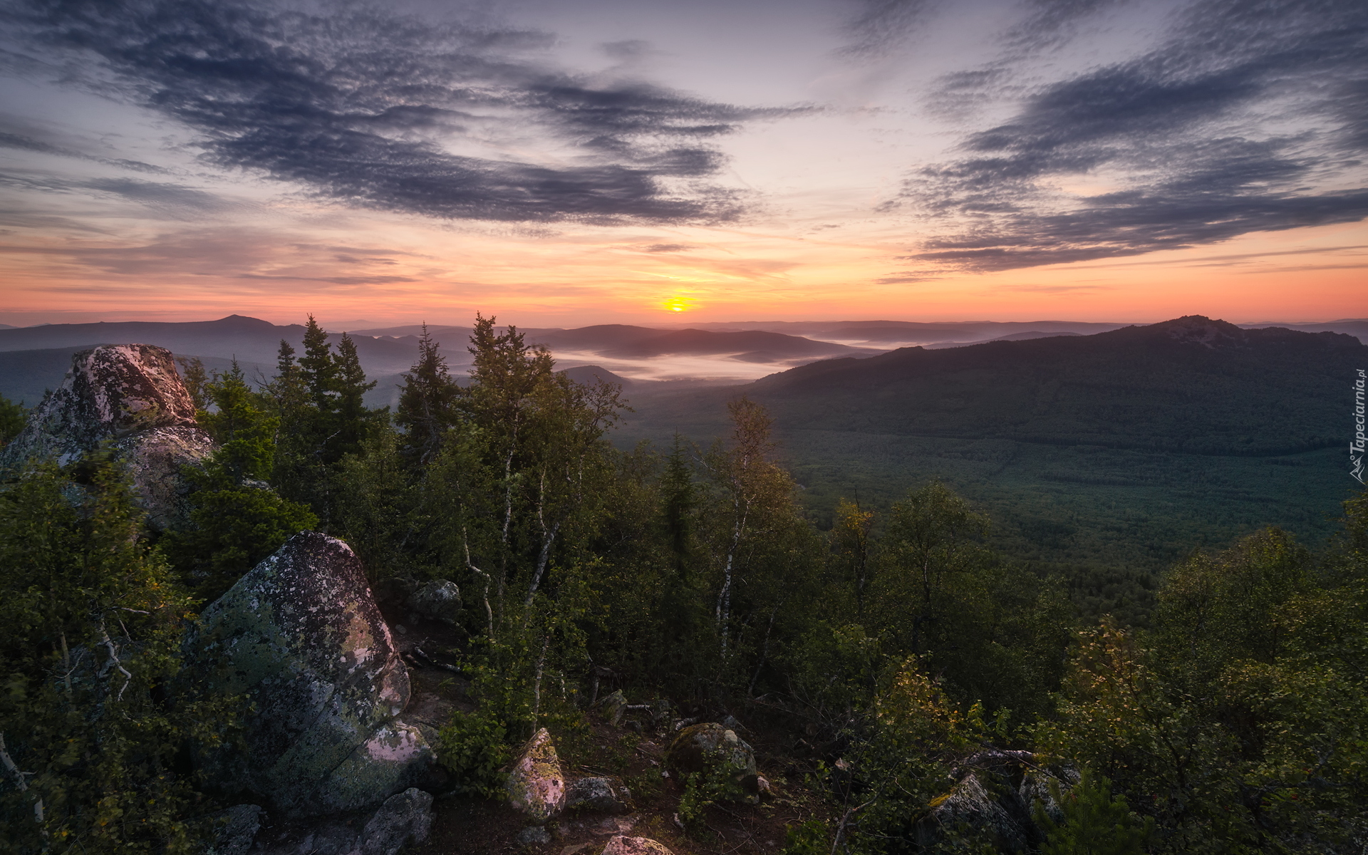 Edytor tapety: Wschód słońca nad lasami i górami