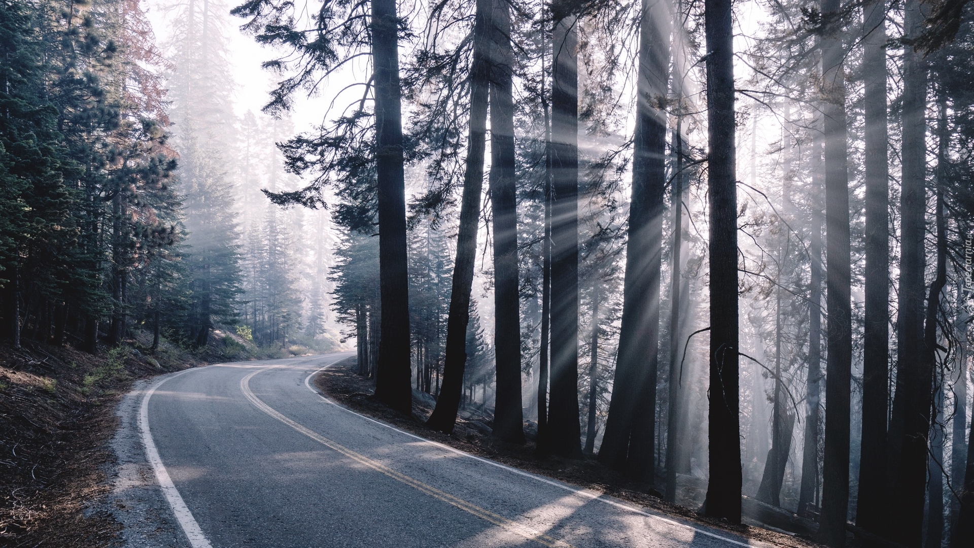Edytor tapety: Słoneczne promienie wśród drzew przy zakręcie drogi