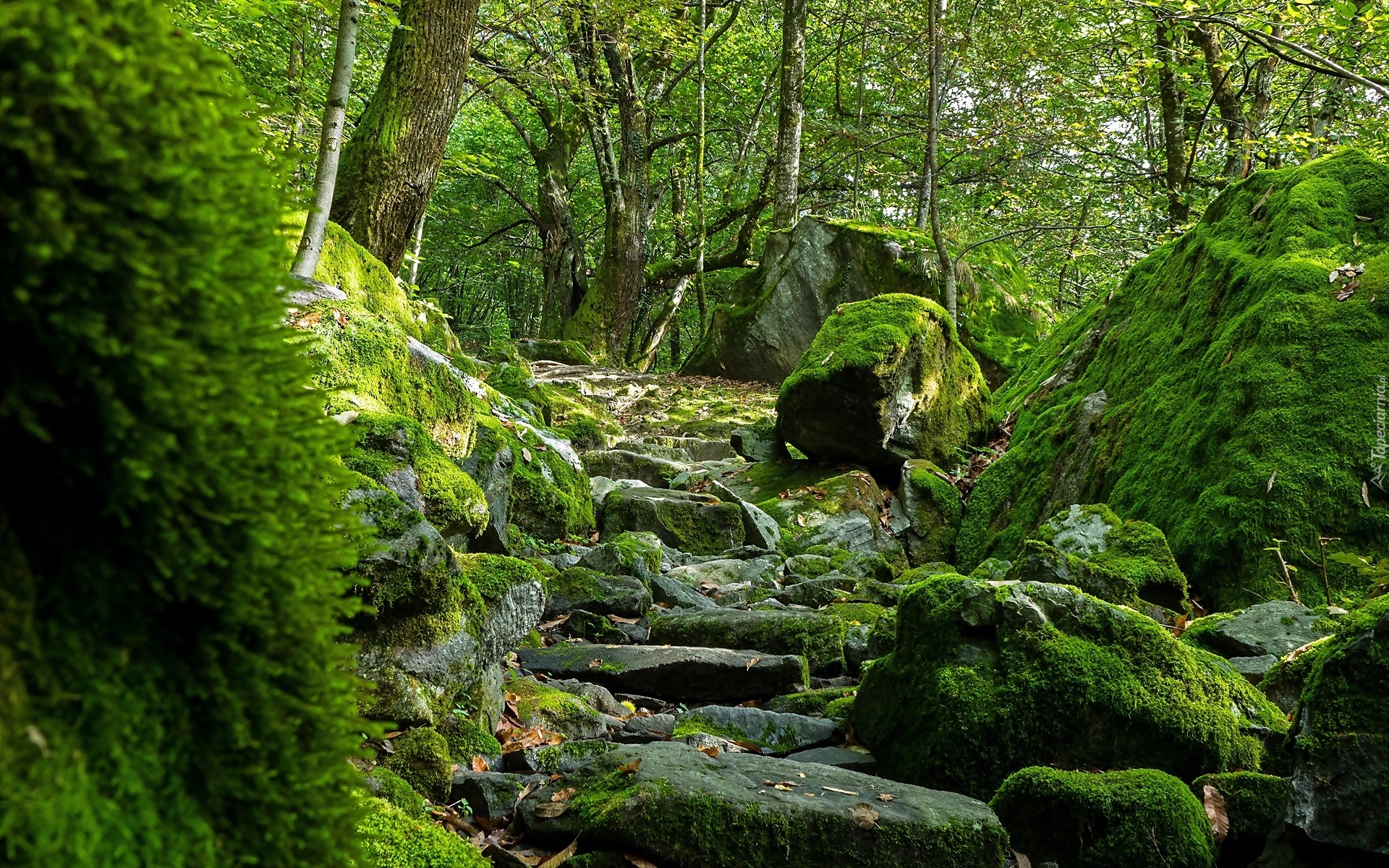 Edytor tapety: Omszałe kamienie i głazy w lesie