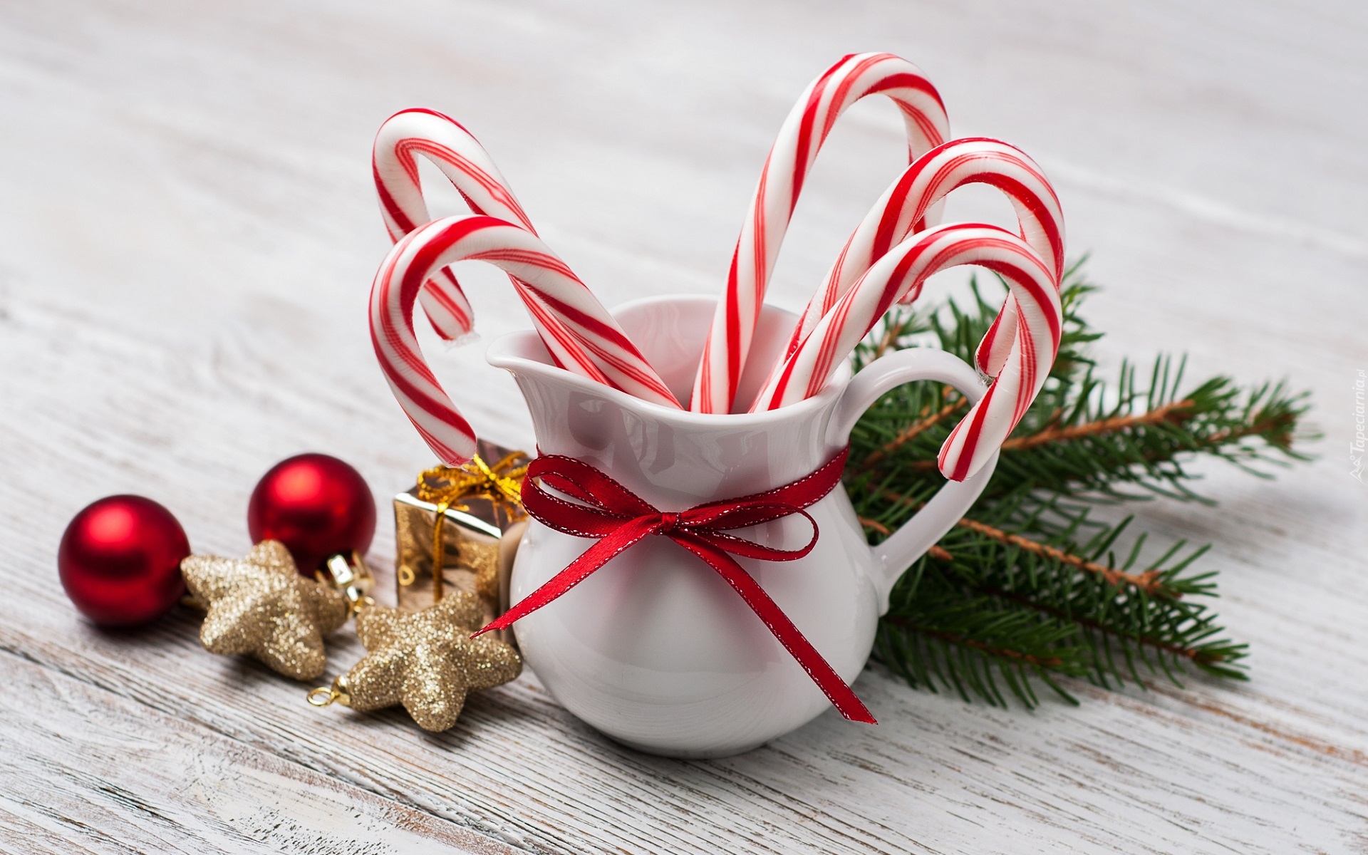 Edytor tapety: Lizaki w dzbanuszku obok gałązki świerku i bombek