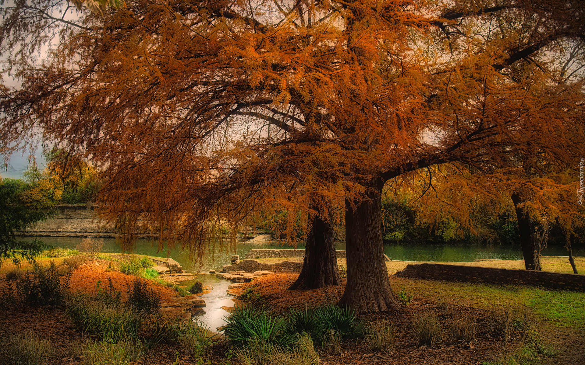 Edytor tapety: Rozłożyste jesienne drzewa nad rzeką