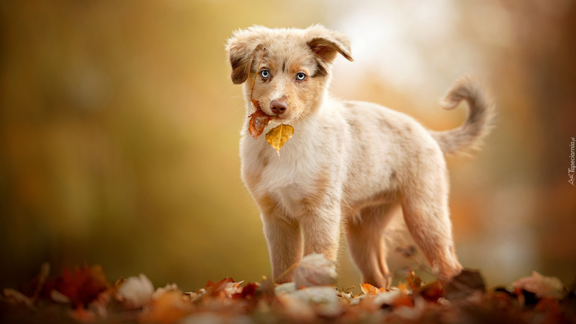 Edytor tapety: Szczeniak owczarka australijskiego z liściem w pysku