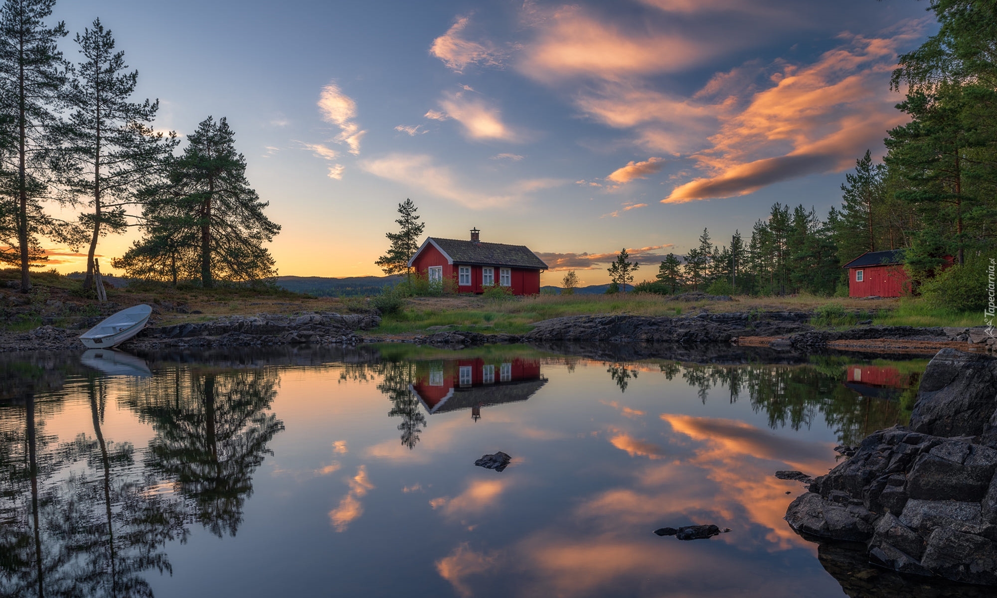Edytor tapety: Domki i łódka nad jeziorem Vaeleren w Norwegii