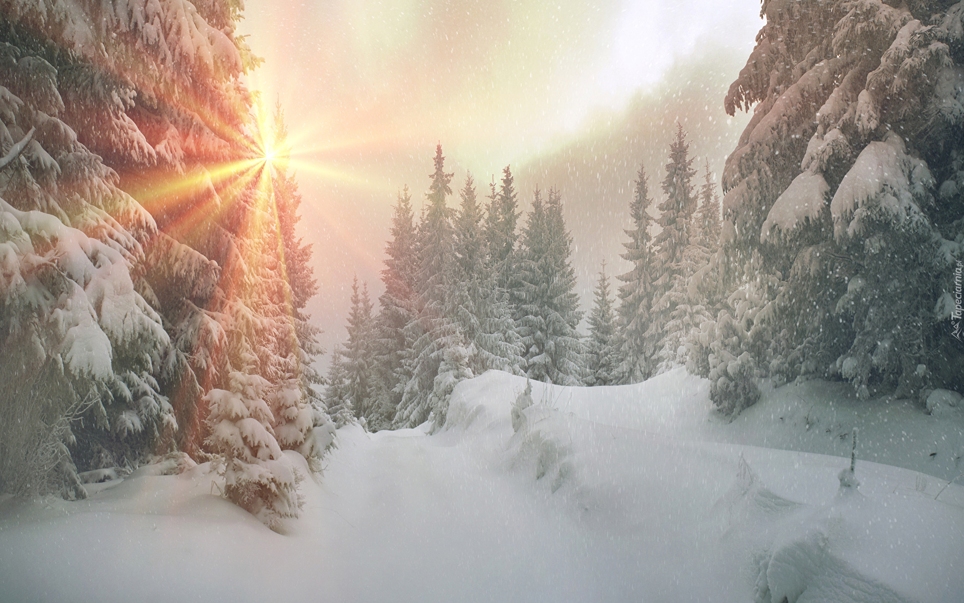 Edytor tapety: Promienie słoneczne w zasypanym śniegiem lesie
