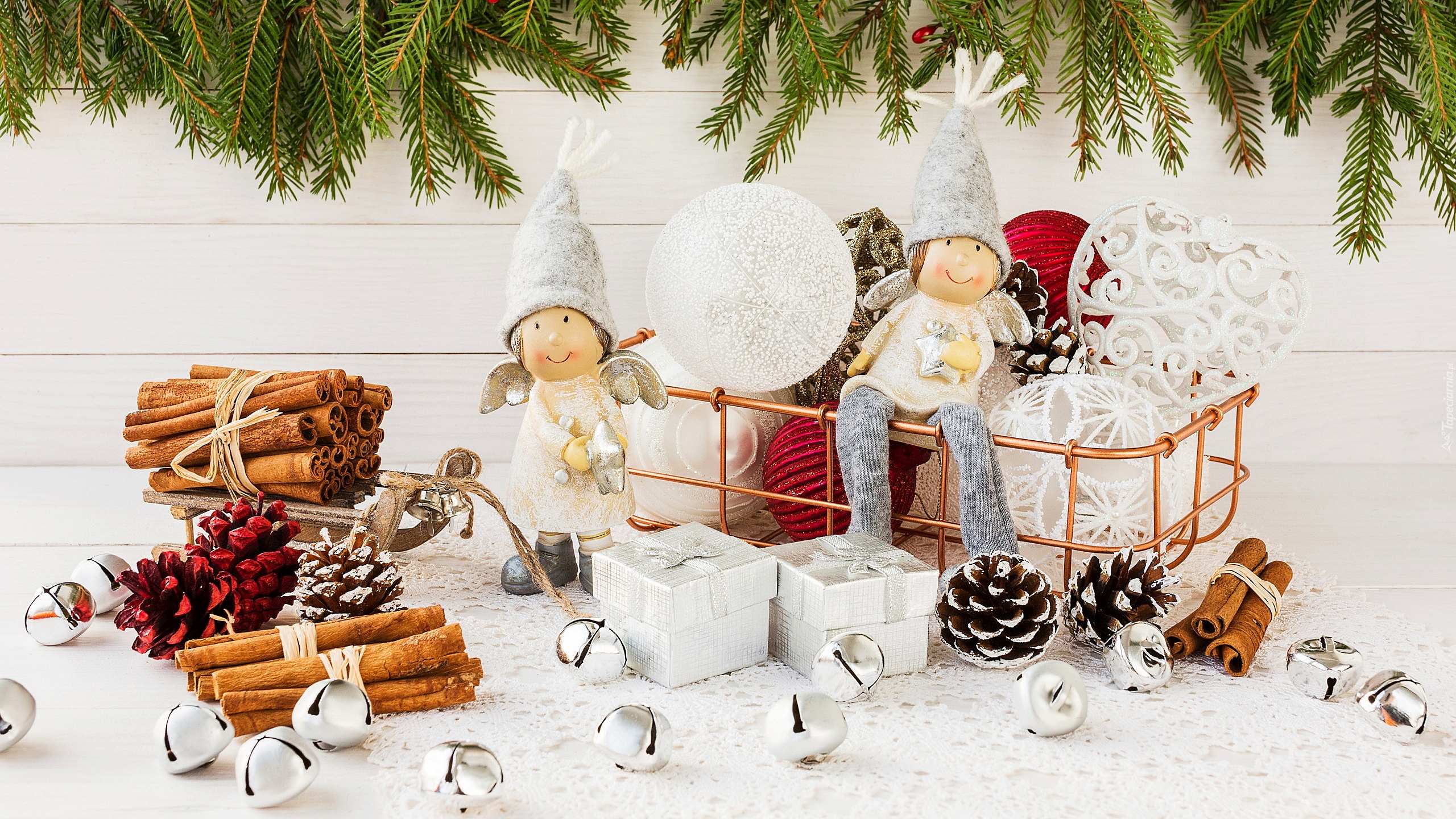 Edytor tapety: Dwa aniołki obok prezencików i szyszek