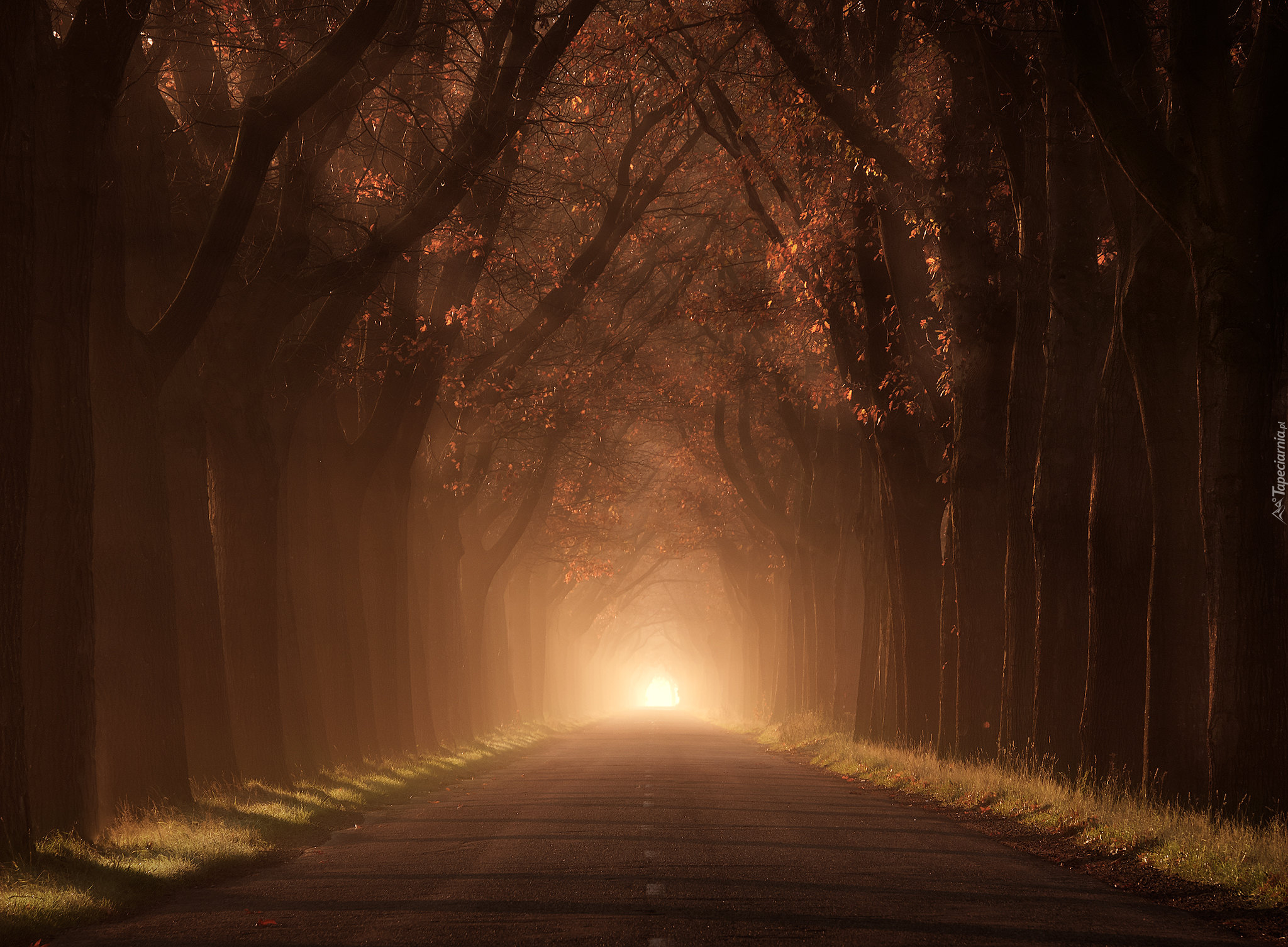 Edytor tapety: Rozświetlona droga wśród drzew