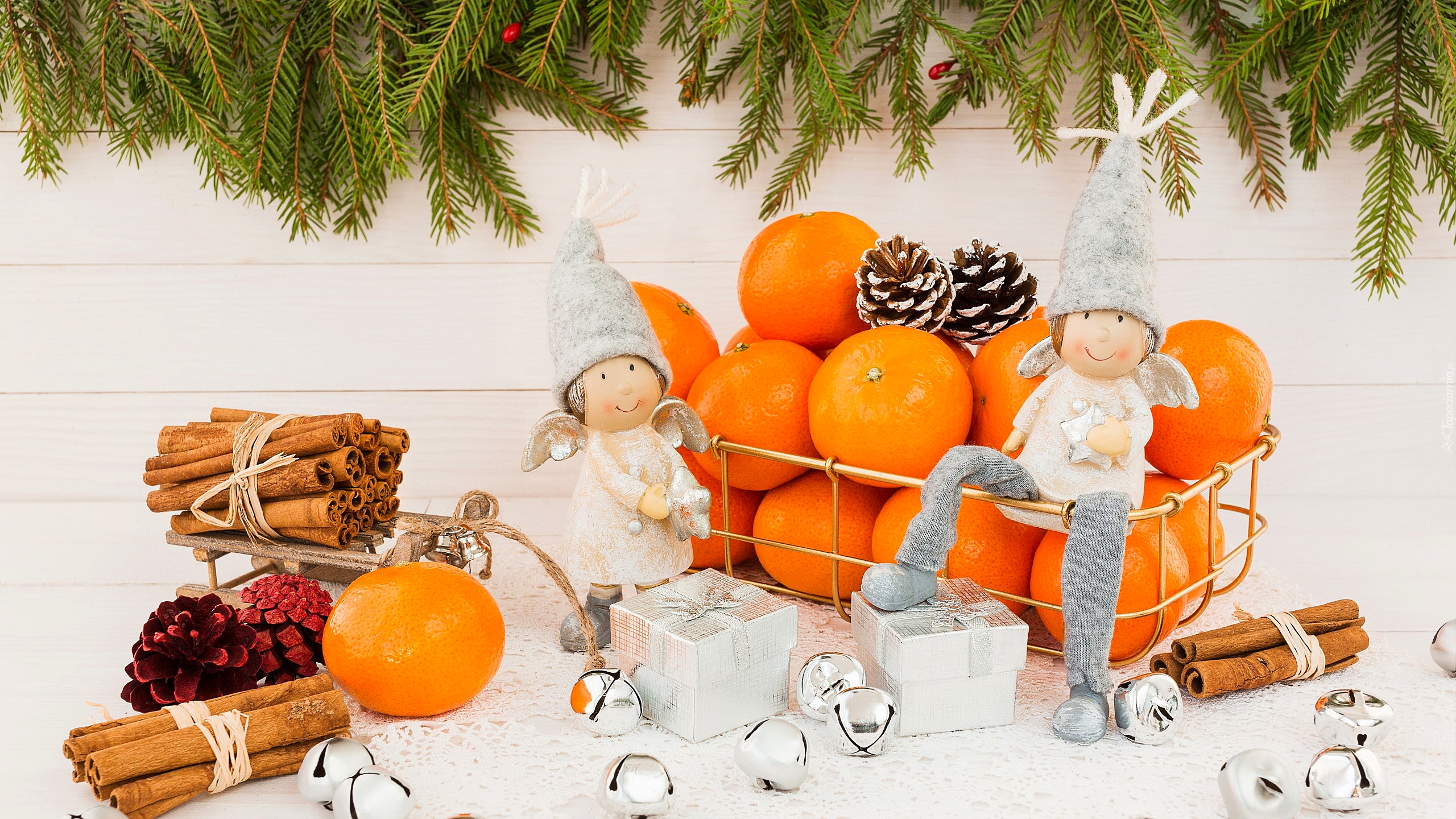 Edytor tapety: Aniołki przy koszyku z mandarynkami