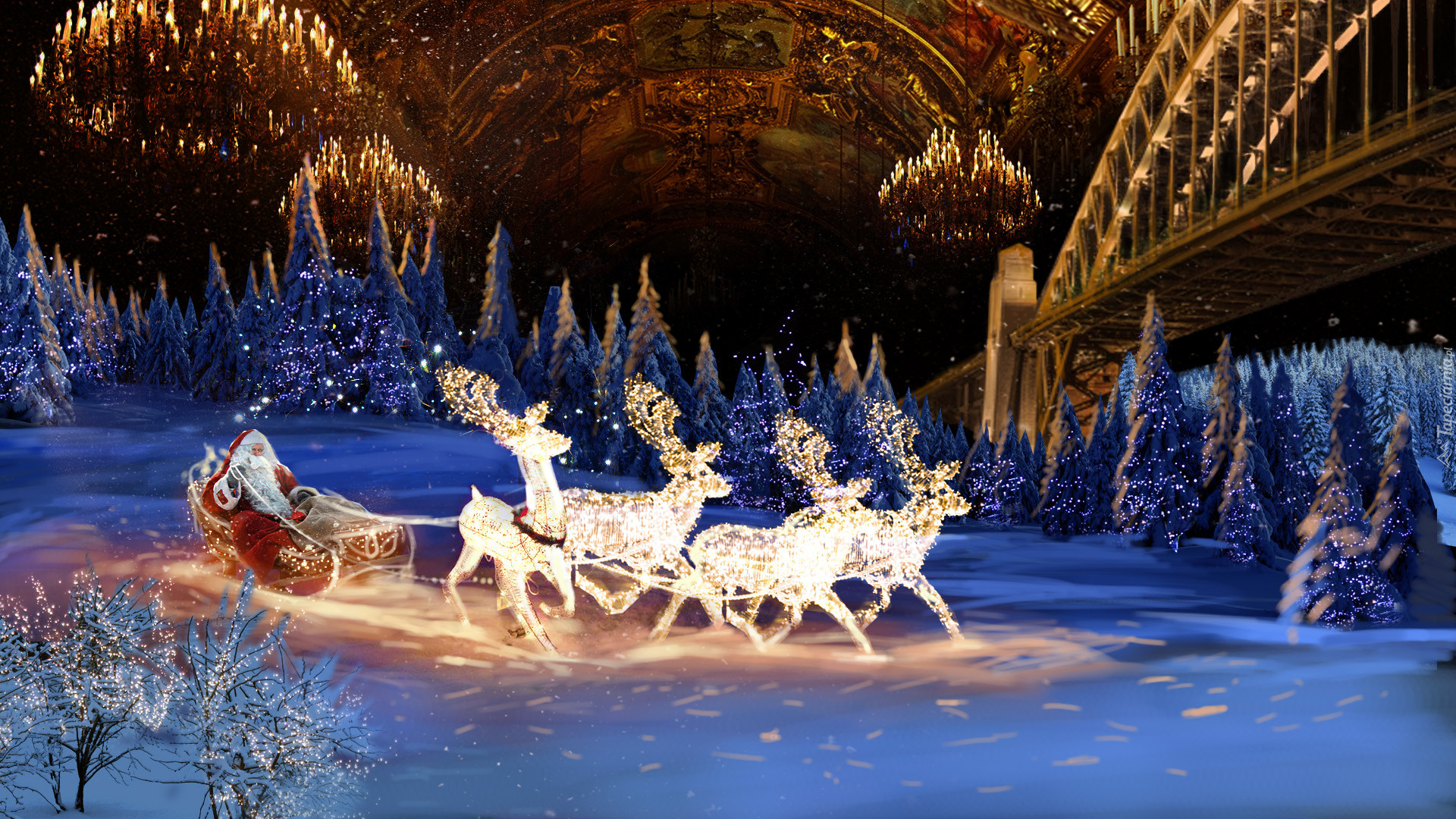 Edytor tapety: Oświetlony zaprzęg Mikołaja z reniferami w grafice