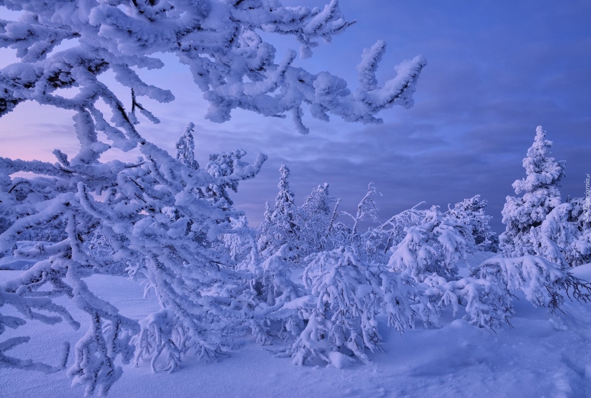 Edytor tapety: Ośnieżone drzewa i krzewy w głębokim śniegu