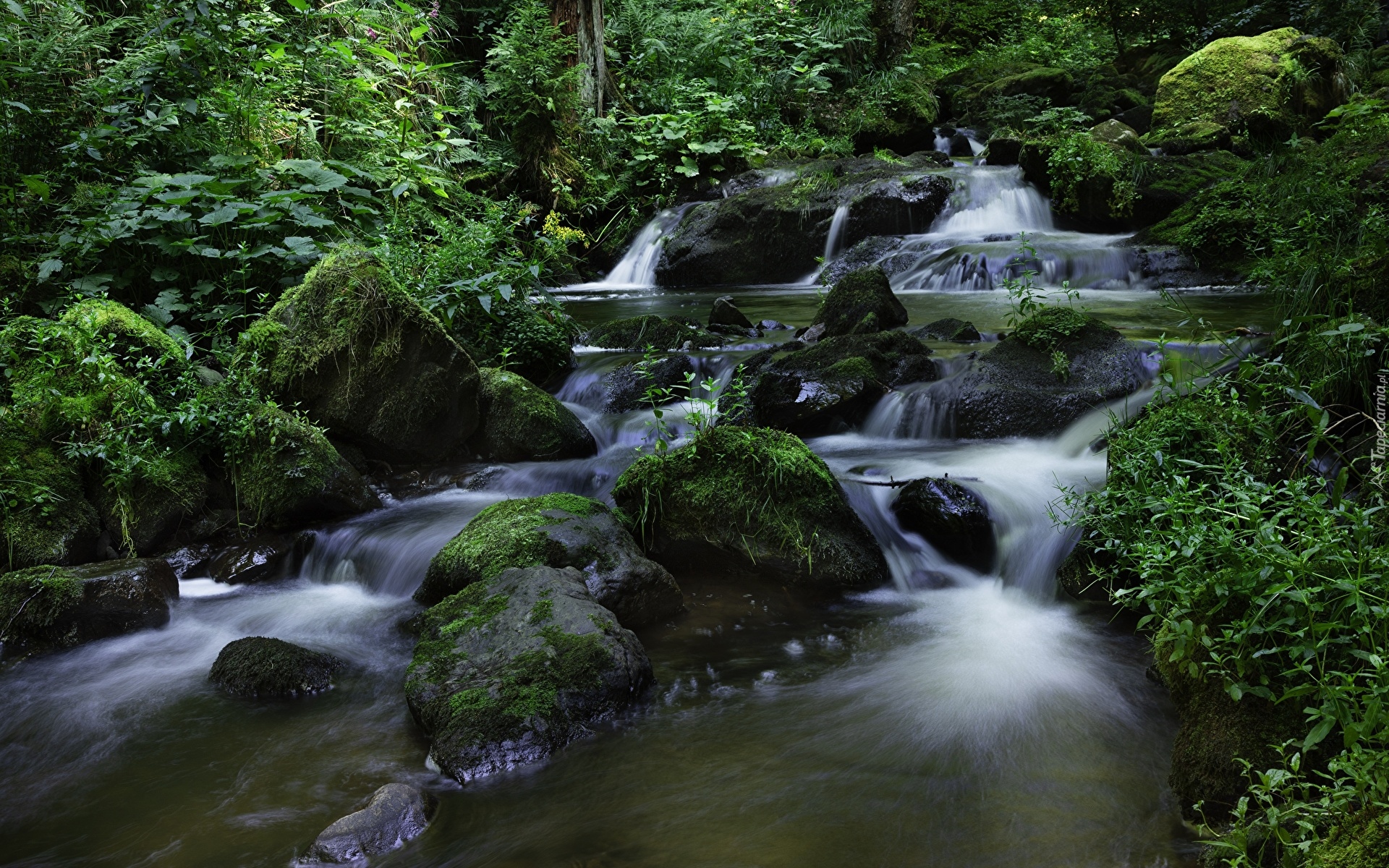 Edytor tapety: Rzeka z omszałymi kamieniami w zielonym lesie