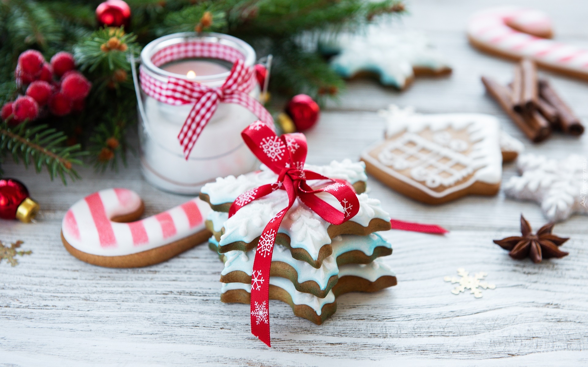 Edytor tapety: Świąteczne pierniczki obok świecy i gałązki choinki
