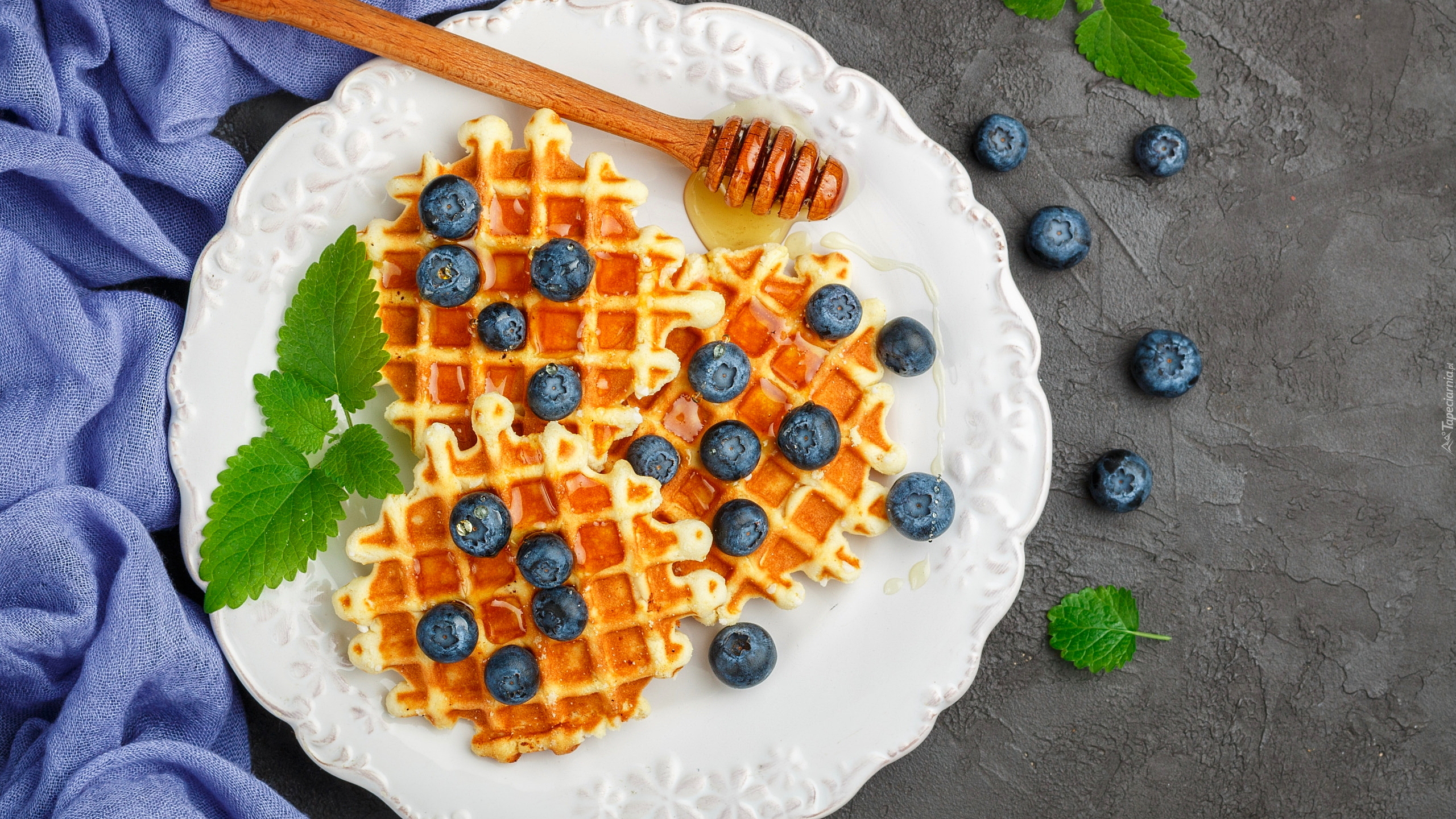 Edytor tapety: Gofry z borówkami i miodem na talerzu