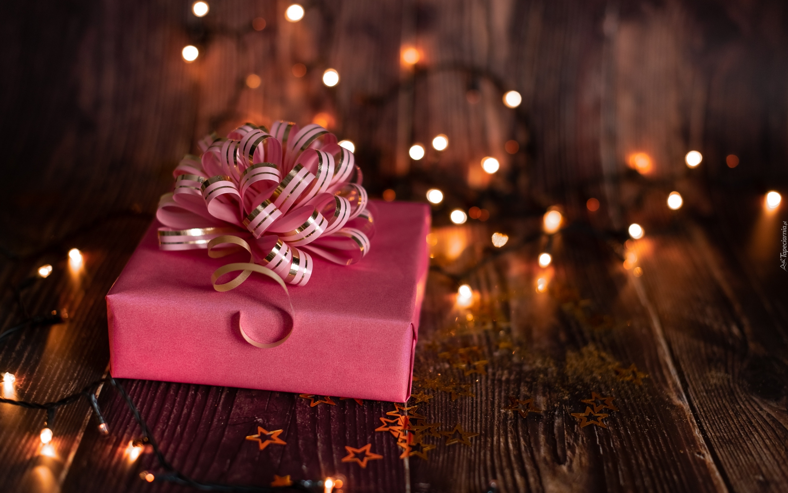 Edytor tapety: Prezent obok świecących lampek