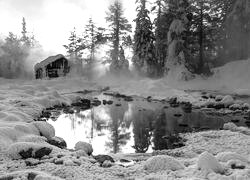 Edytor tapety: Szopa nad źródłami termalnymi w zaśnieżonym lesie