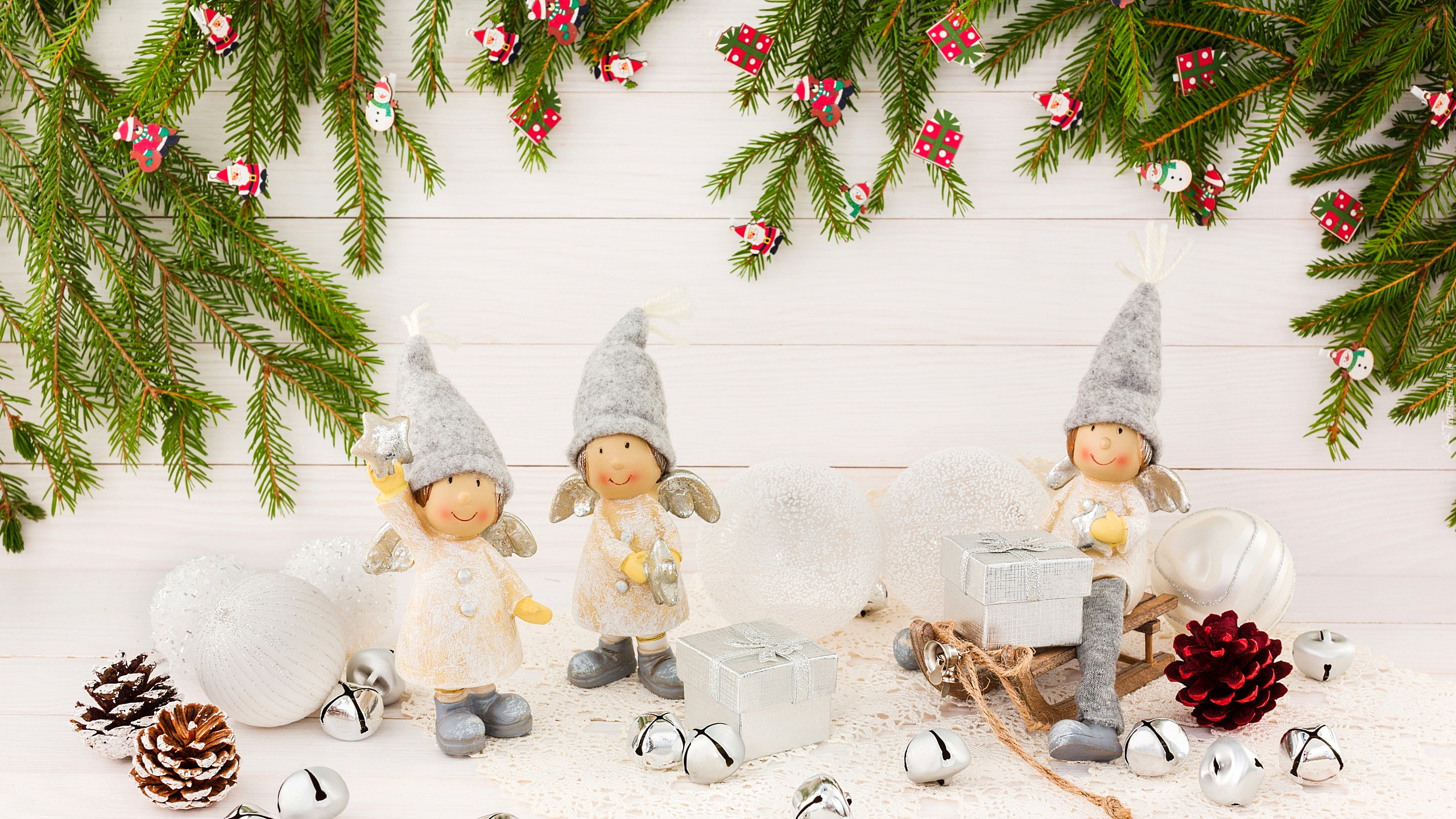 Edytor tapety: Aniołki z prezentami pod gałązkami choinki