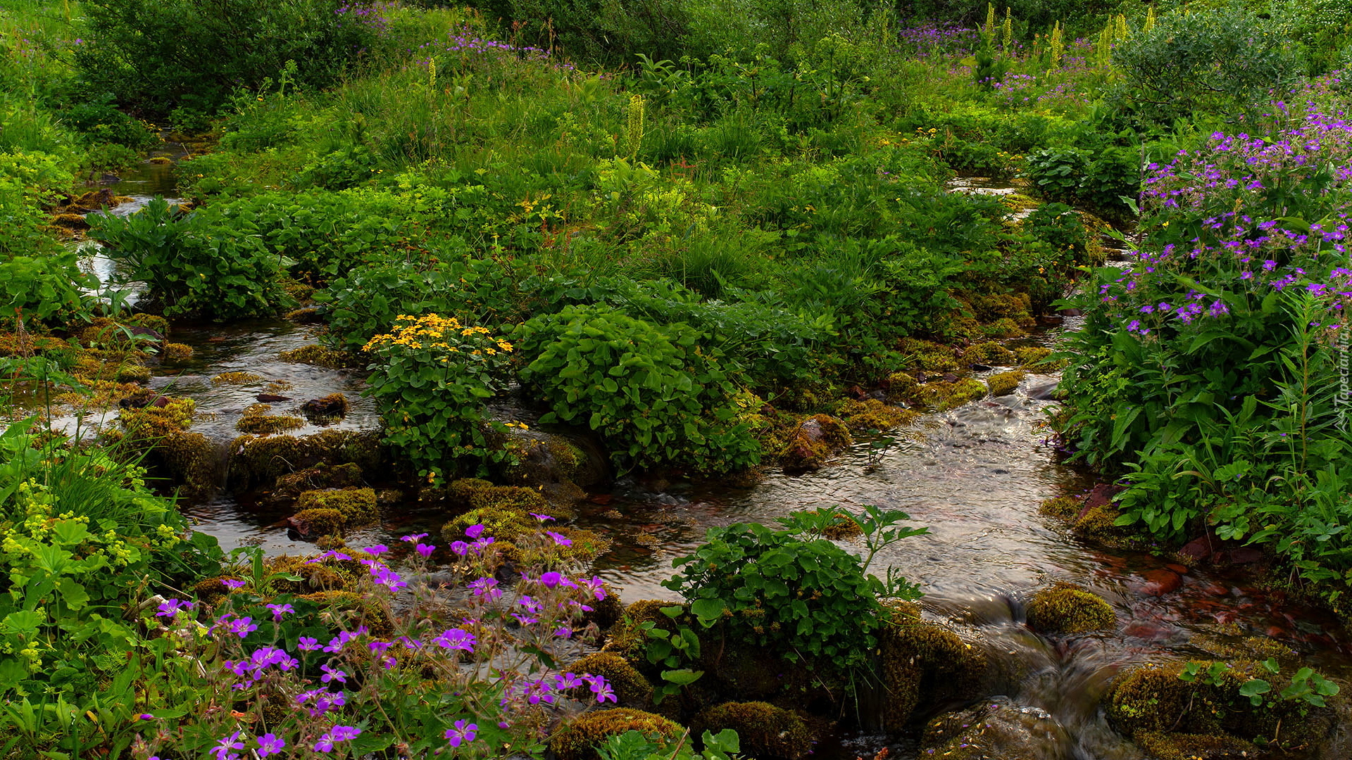 Edytor tapety: Wiosenne kwiaty i rośliny na brzegu kamienistego potoku