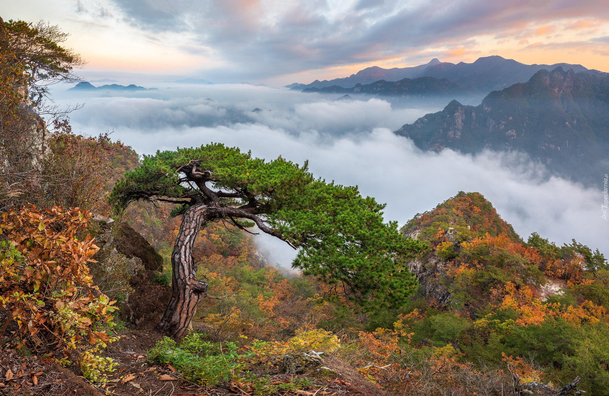 Edytor tapety: Sosna na skale z widokiem na zamglone góry