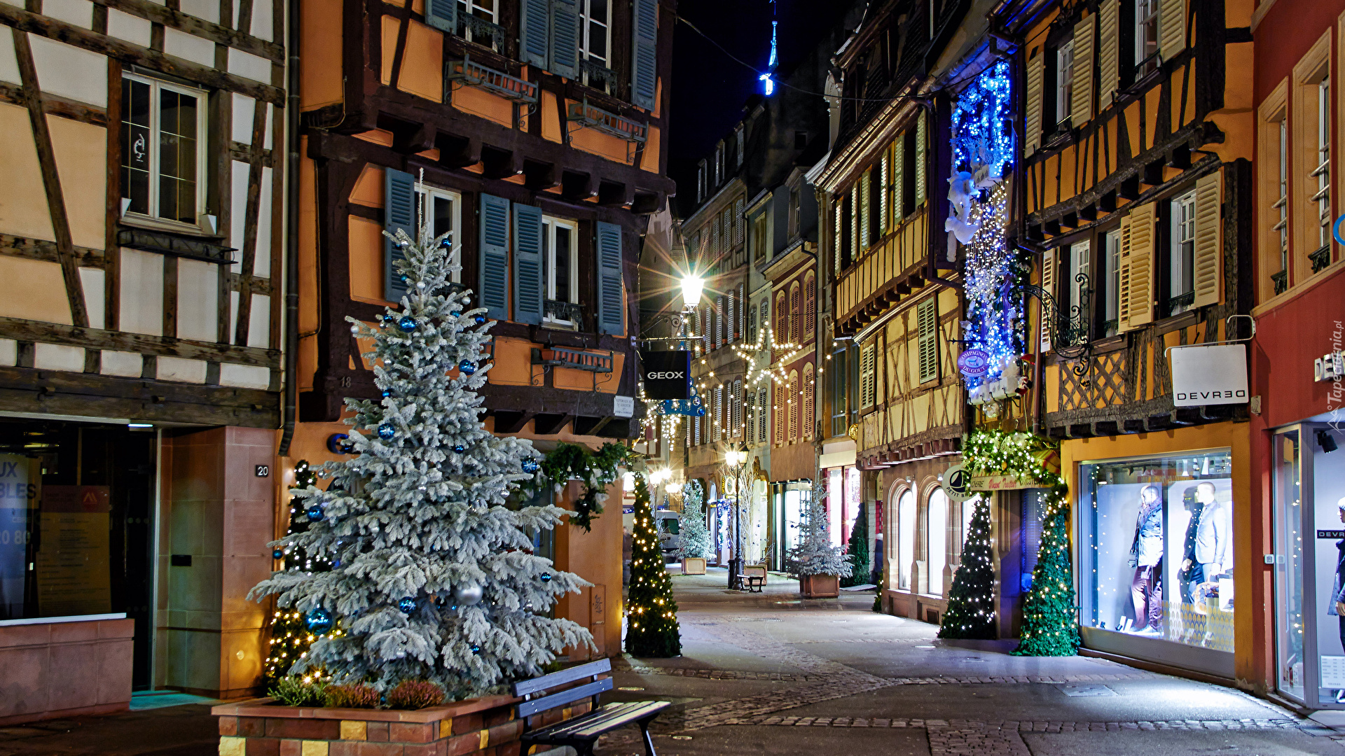 Edytor tapety: Domy i uliczka ozdobione dekoracjami bożonarodzeniowymi