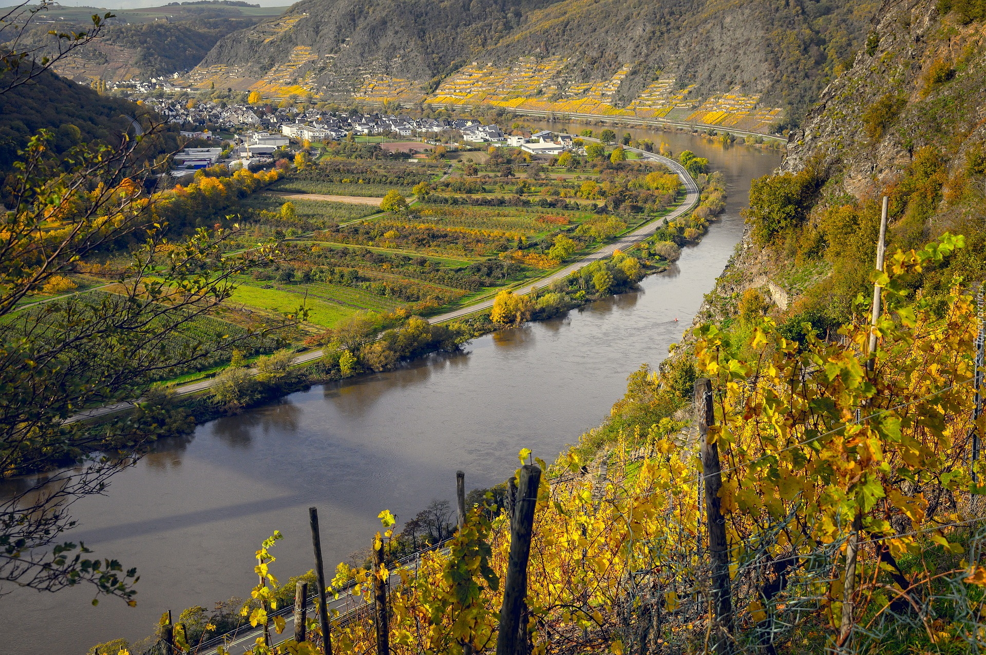 Edytor tapety: Winnice na wzgórzach nad rzeką Mozela w Niemczech