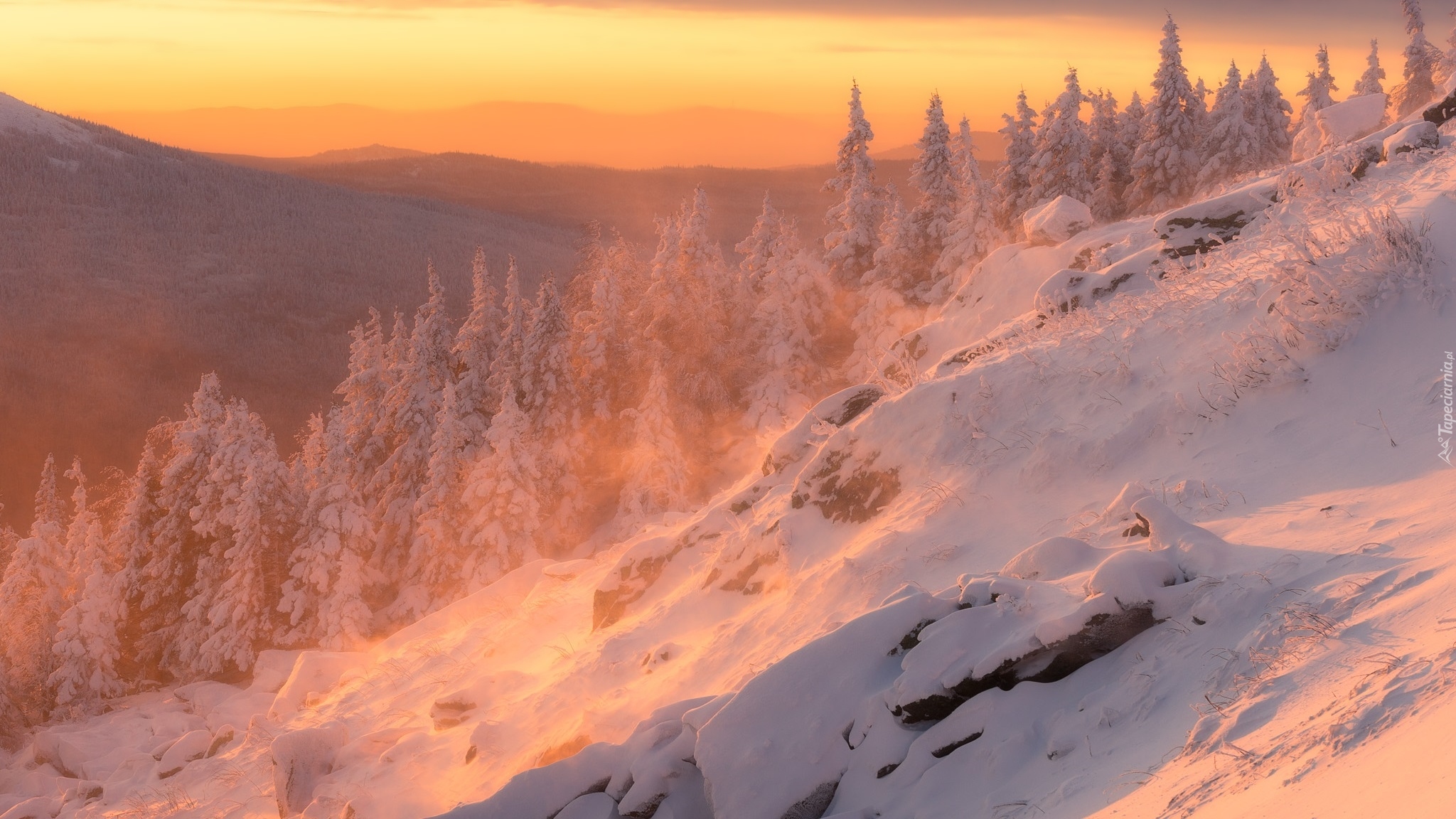 Edytor tapety: Ośnieżone świerki na wzgórzu w blasku słońca