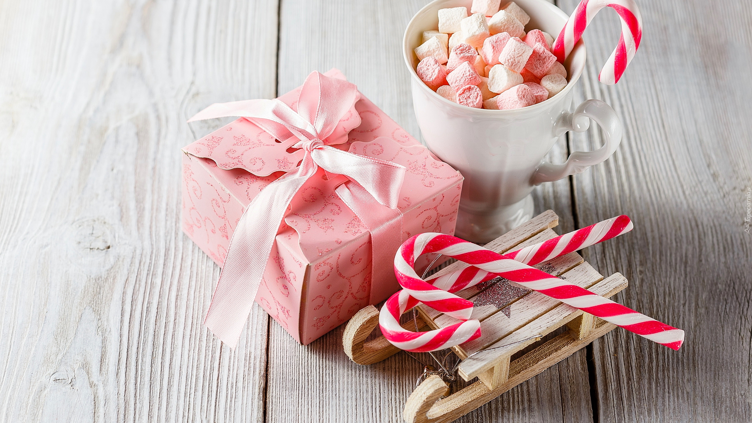 Edytor tapety: Prezent i lizaki obok filiżanki z piankami