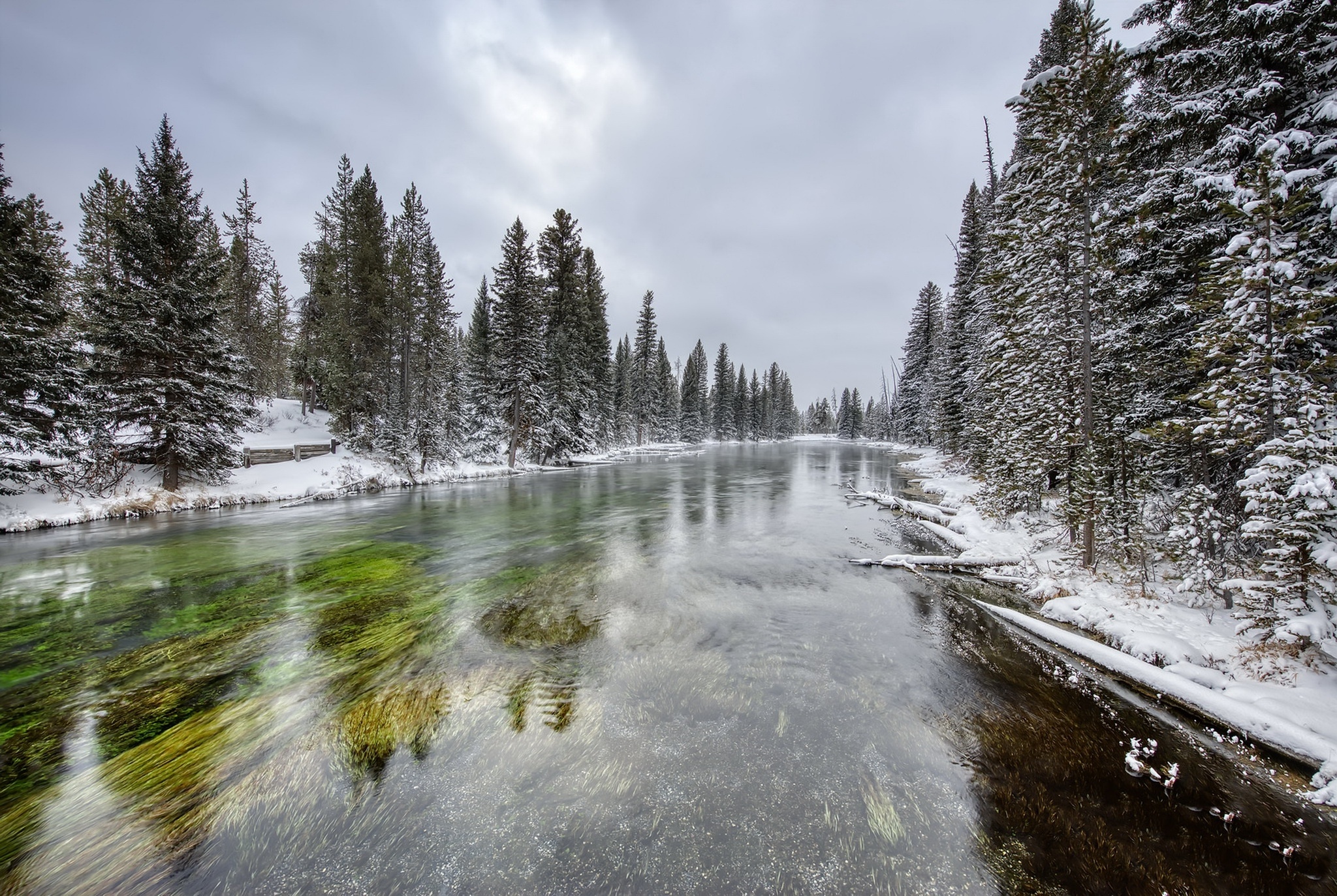 Edytor tapety: Zaśnieżone świerki nad rzeką