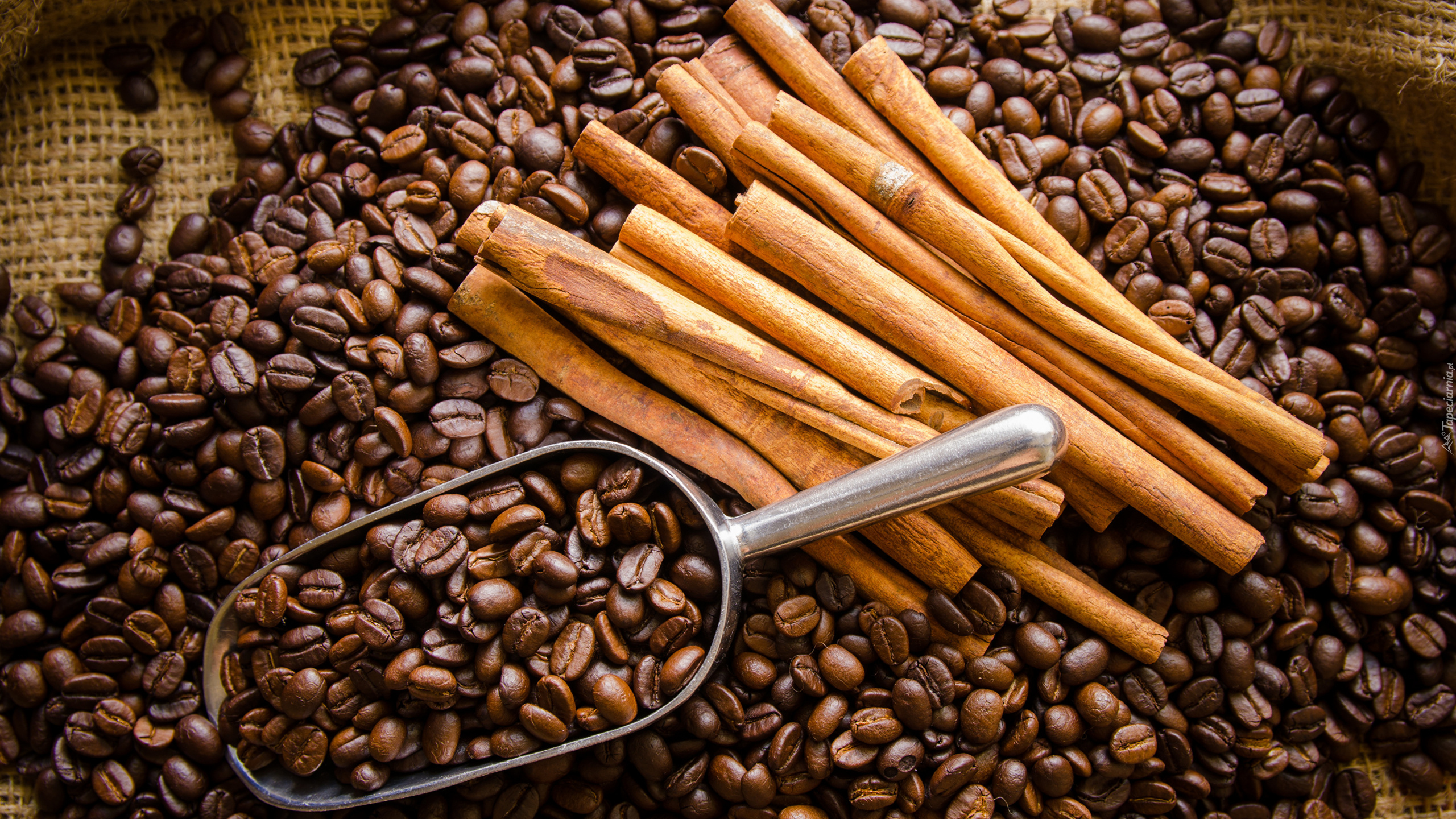 Edytor tapety: Laski cynamonu na ziarnach kawy
