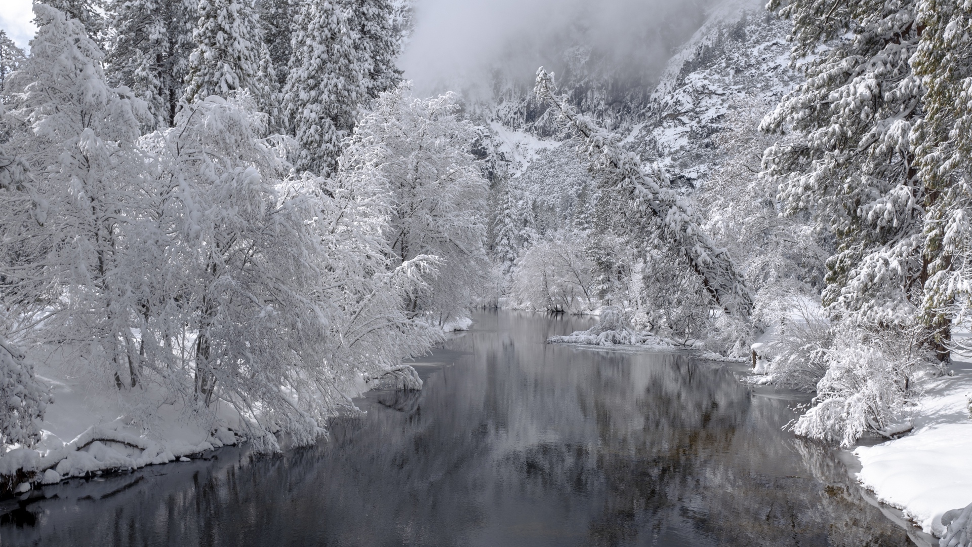 Edytor tapety: Zaśnieżone drzewa nad rzeką