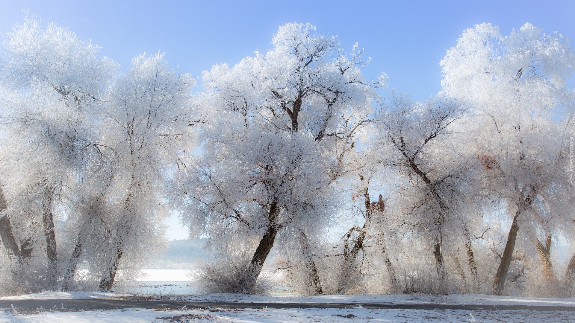Edytor tapety: Oszronione drzewa nad rzeką w pogodny dzień