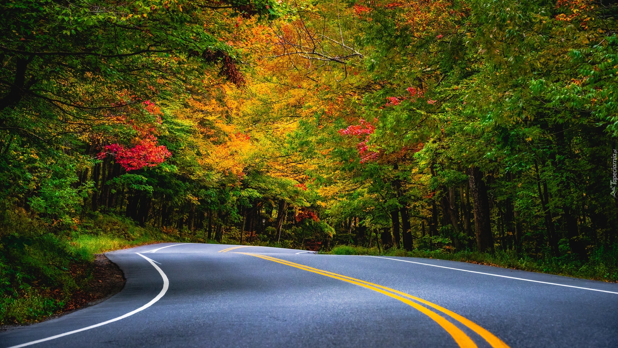 Edytor tapety: Jesienne drzewa przy zakręcie drogi