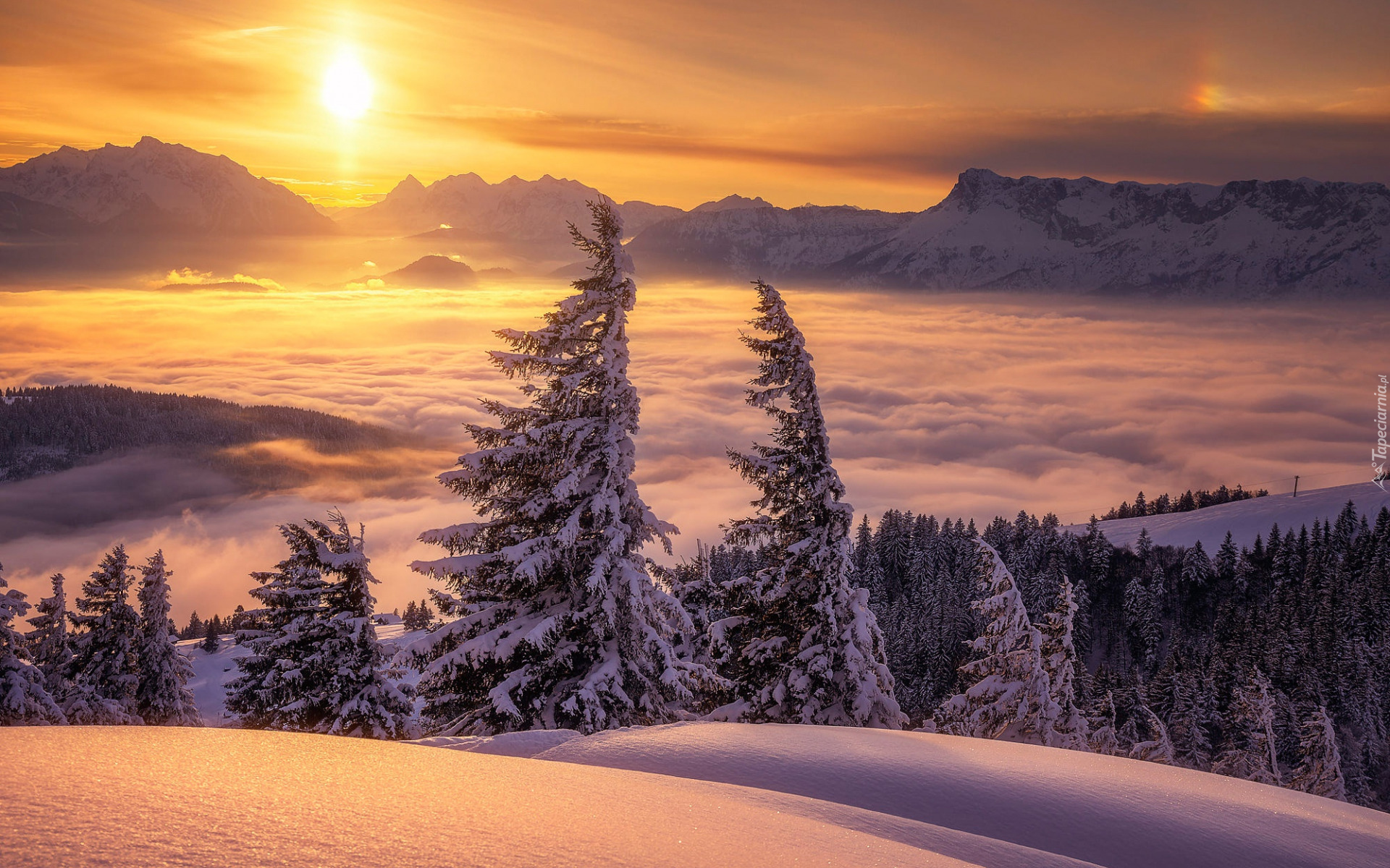 Edytor tapety: Ośnieżone świerki nad zamglonymi lasami o zachodzie słońca