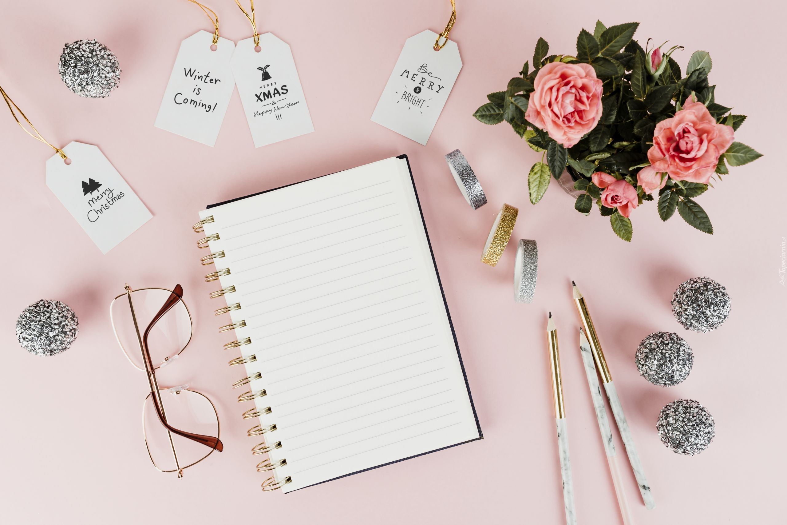 Edytor tapety: Notatnik pośród świątecznych zawieszek i róż