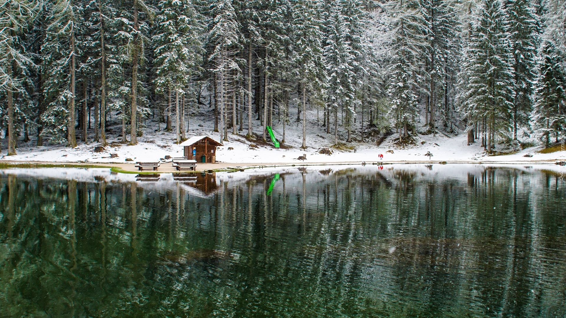 Edytor tapety: Drewniany domek nad jeziorem w lesie