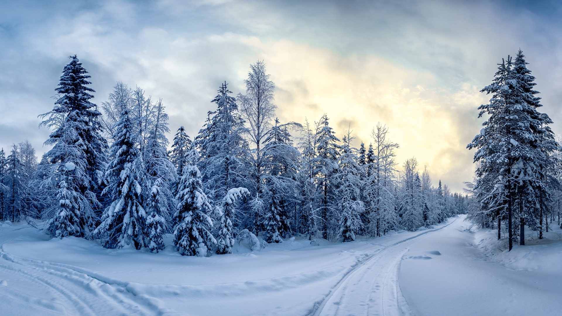 Edytor tapety: Droga w śniegu prowadząca przez las