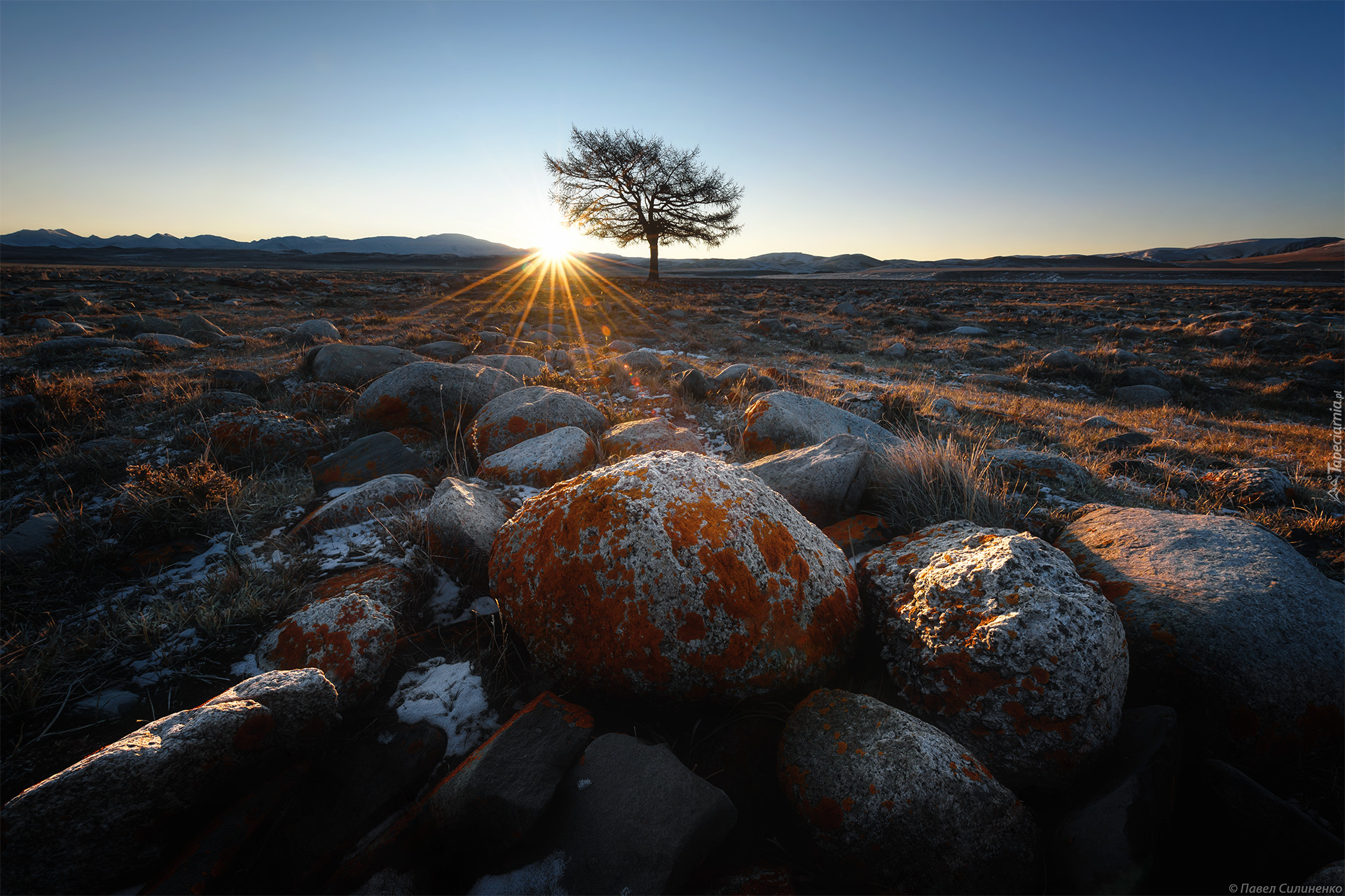 Edytor tapety: Drzewo i kamienie w blasku słońca