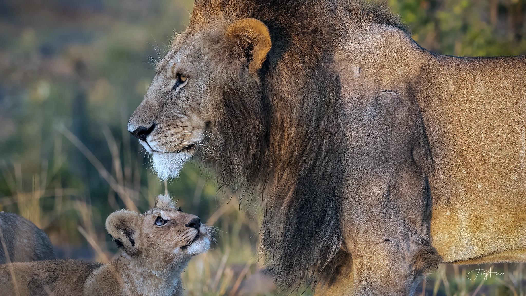 Edytor tapety: Lwiątko spoglądające na dużego lwa